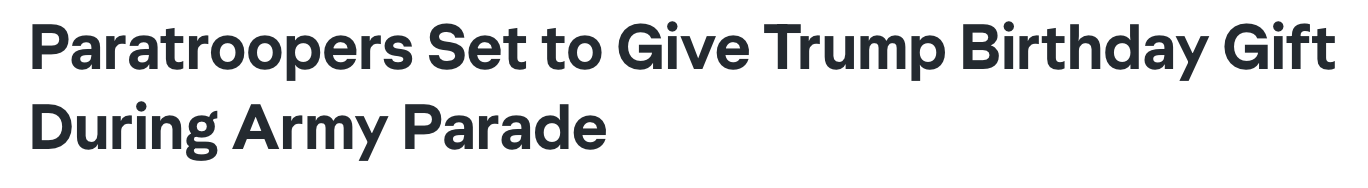 We know the costs of this kind of reckless display. Experts estimate Trump's military parade could cost taxpayers up to $45 million – money that could support veterans, fund healthcare, or help struggling families. Instead, the Army’s parachute team will descend onto the streets and personally deliver an American flag birthday gift to Trump.