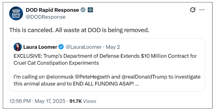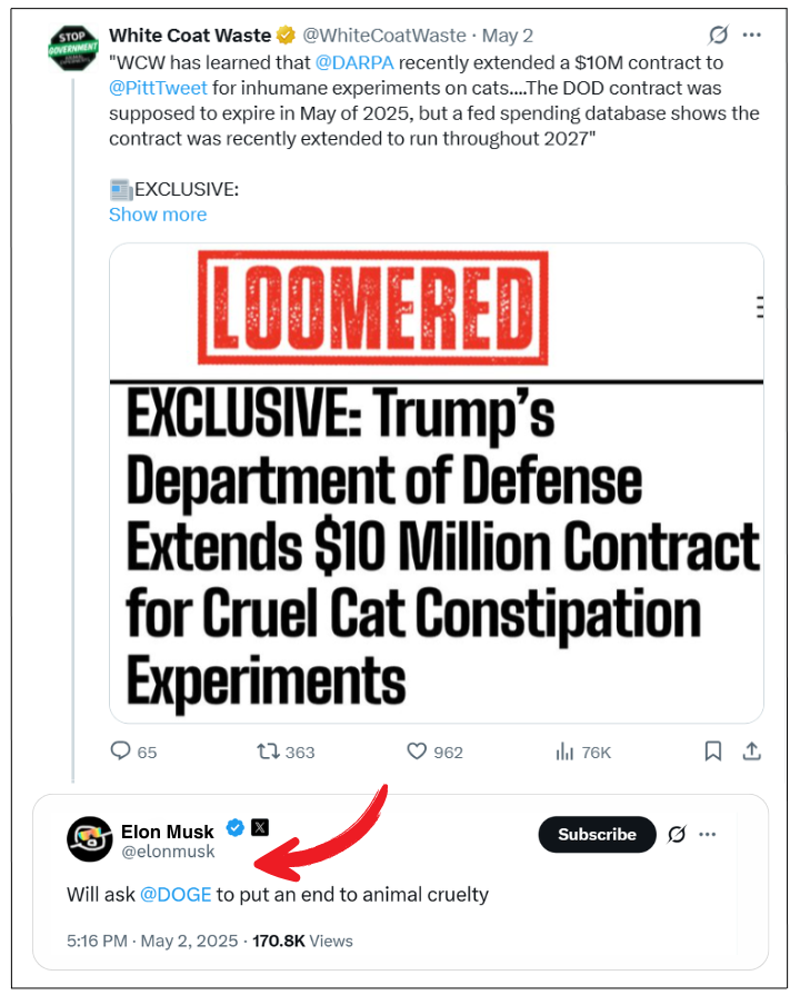 The Navy’s decision also follows viral bipartisan advocacy in support of WCW’s campaign. Laura Loomer and Elon Musk supercharged our investigation, the latter of whom posted about the Navy’s cat testing, “Will ask @DOGE to put an end to animal cruelty.”