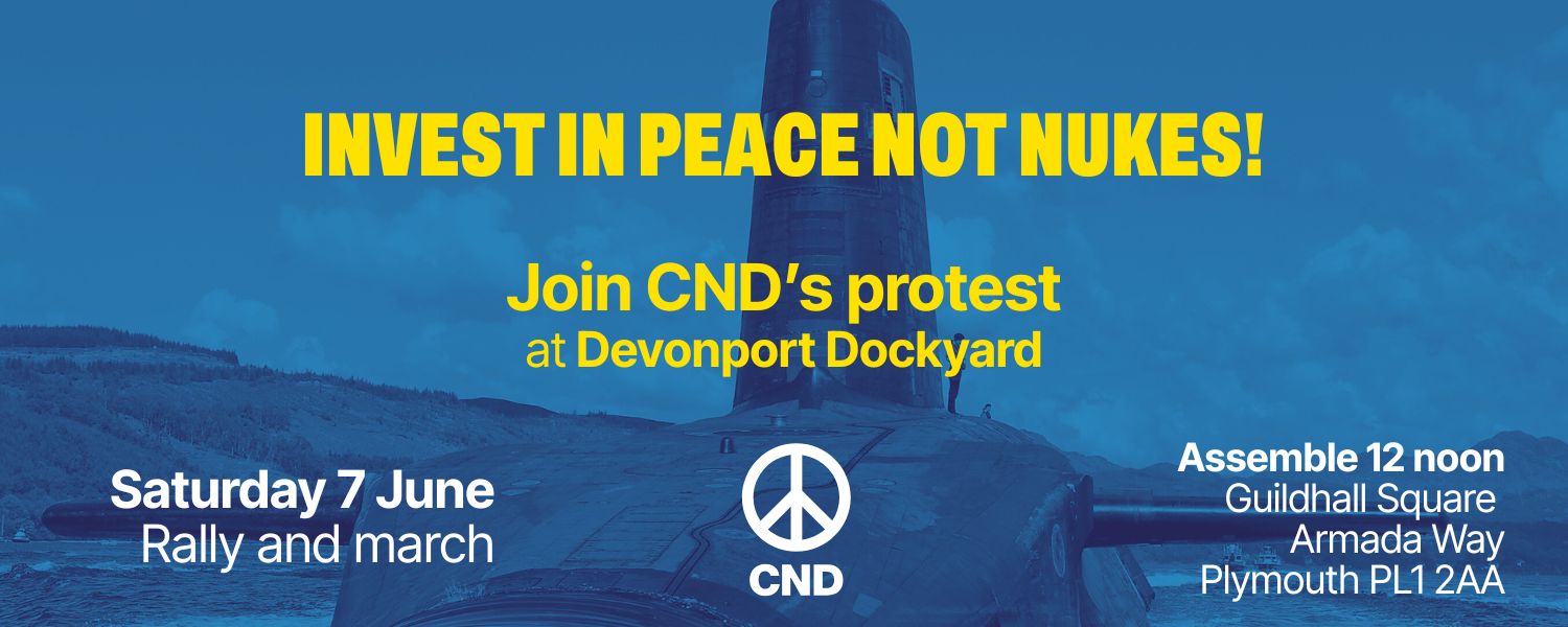 Invest in Peace not Nukes: Join the protest at the Devonport Dockyard this Saturday! We've had a huge amount of local press coverage for this protest! This is really putting pressure onto the local MP and Armed Forces Minister, Luke Pollard! Plymouth CND and CND Chair Tom Unterrainer joined Devonport residents outside his offices to protest the dangers of living next to a nuclear base and how the nuclear weapons industry brings economic deprivation, not prosperity, to areas like Devonport. Read more about the action here.