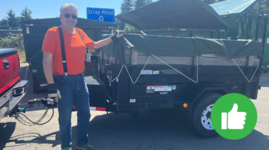 Customer standing next to their correctly secured vehicle load, using a tarp, ratchet straps, and bungee cords.