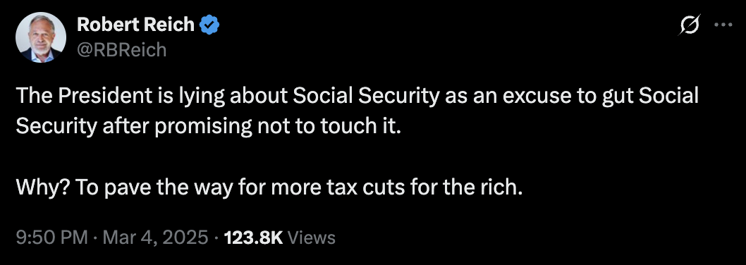 But Democrats know how critical Social Security is to everyday Americans… that’s why Robert Reich is calling Trump out on his dangerous plans ↘↘