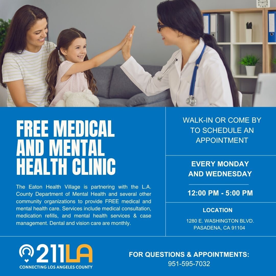 The Eaton Health Village is providing FREE medical and mental health care every Monday and Wednesday from Noon to 5 p.m. at the Pasadena Seventh-Day Adventist Center, located at 1280 E. Washington Blvd., Pasadena, CA.
