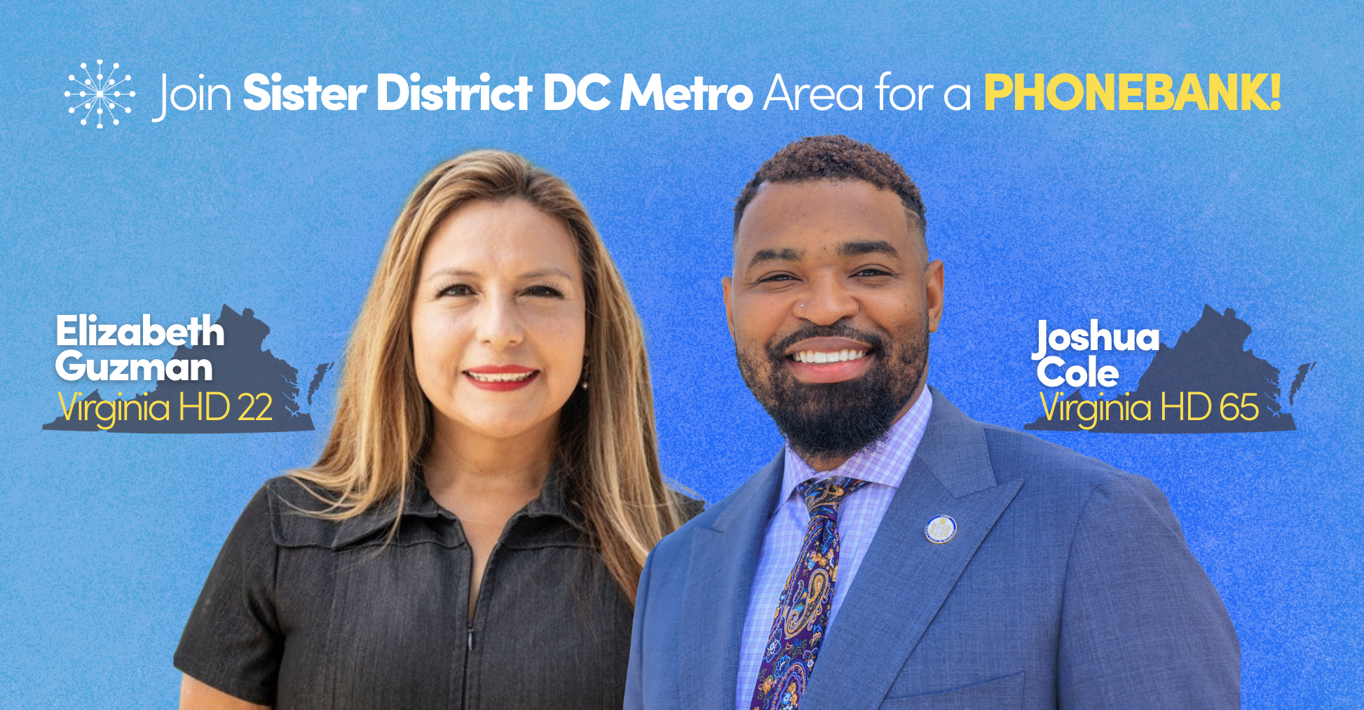 Sister District DC Metro Area is thrilled to announce that we will be holding a live fundraiser for Joshua Cole (VA House 65) and Elizabeth Guzman (VA House 22) with members of The Woman's National Democratic Club, on Thursday, Sept 29, 2025.
