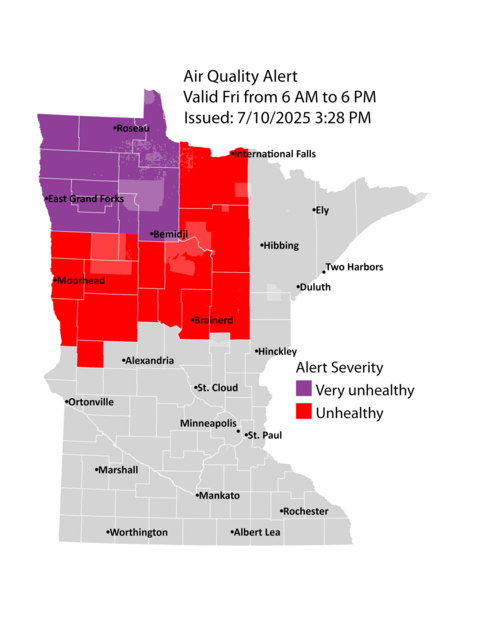The Minnesota Pollution Control Agency (MPCA) has issued an air quality alert for northwest and north central Minnesota. The alert takes effect 6 a.m. on Friday, July 11, and runs until 6 p.m. on Friday, July 11. The affected area includes Brainerd, Bemidji, East Grand Forks, Moorhead, International Falls, Roseau, and the Tribal Nations of Mille Lacs, Leech Lake, White Earth, and Red Lake.
