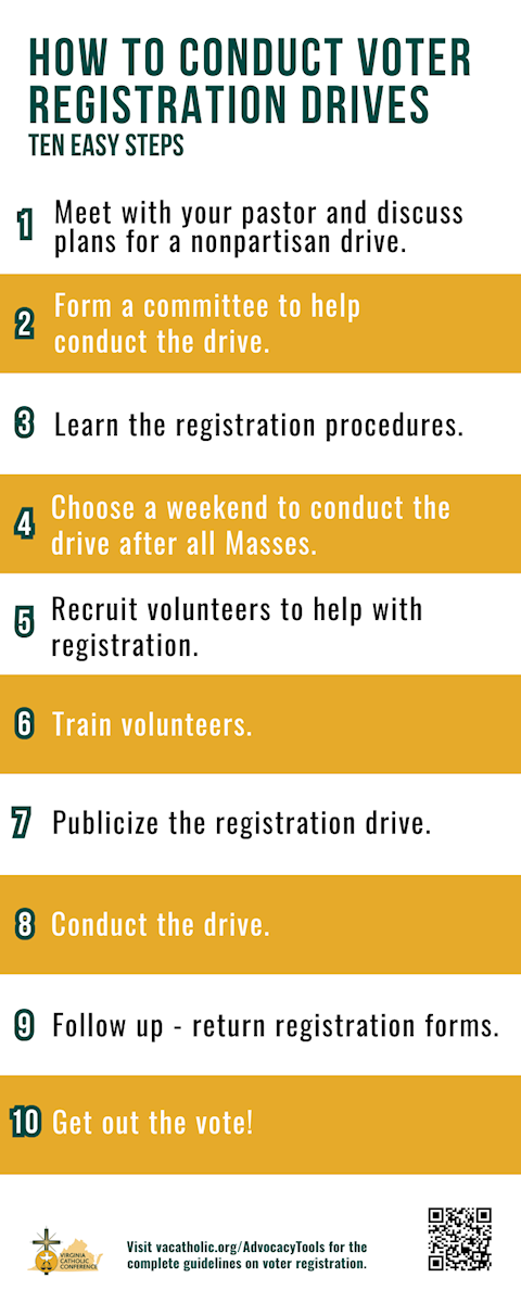 One very effective way for parishes to help voting-age members participate in the political process is by conducting nonpartisan voter registration drives. The Virginia Catholic Conference has updated its voter registration guide, which includes 10 easy steps for conducting a drive. Parishes are highly encouraged to consider conducting drives using this resource. Please contact us at 804.225.8565 or at [email protected] with any questions or for further assistance.