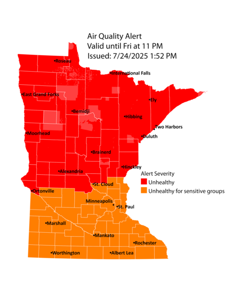 The Minnesota Pollution Control Agency (MPCA) has expanded the air quality alert to include southeast Minnesota. The alert runs until 11 p.m. on Friday, July 25. The affected area includes the Twin Cities metro area, Brainerd, Alexandria, Albert Lea, Marshall, Worthington, Hinckley, St. Cloud, Ortonville, Mankato, Bemidji, East Grand Forks, Moorhead, International Falls, Two Harbors, Hibbing, Ely, Duluth, Roseau, and the Tribal Nations of Upper Sioux, Mille Lacs, Prairie Island, Leech Lake, White Earth, Red Lake, Grand Portage, and Fond du Lac.