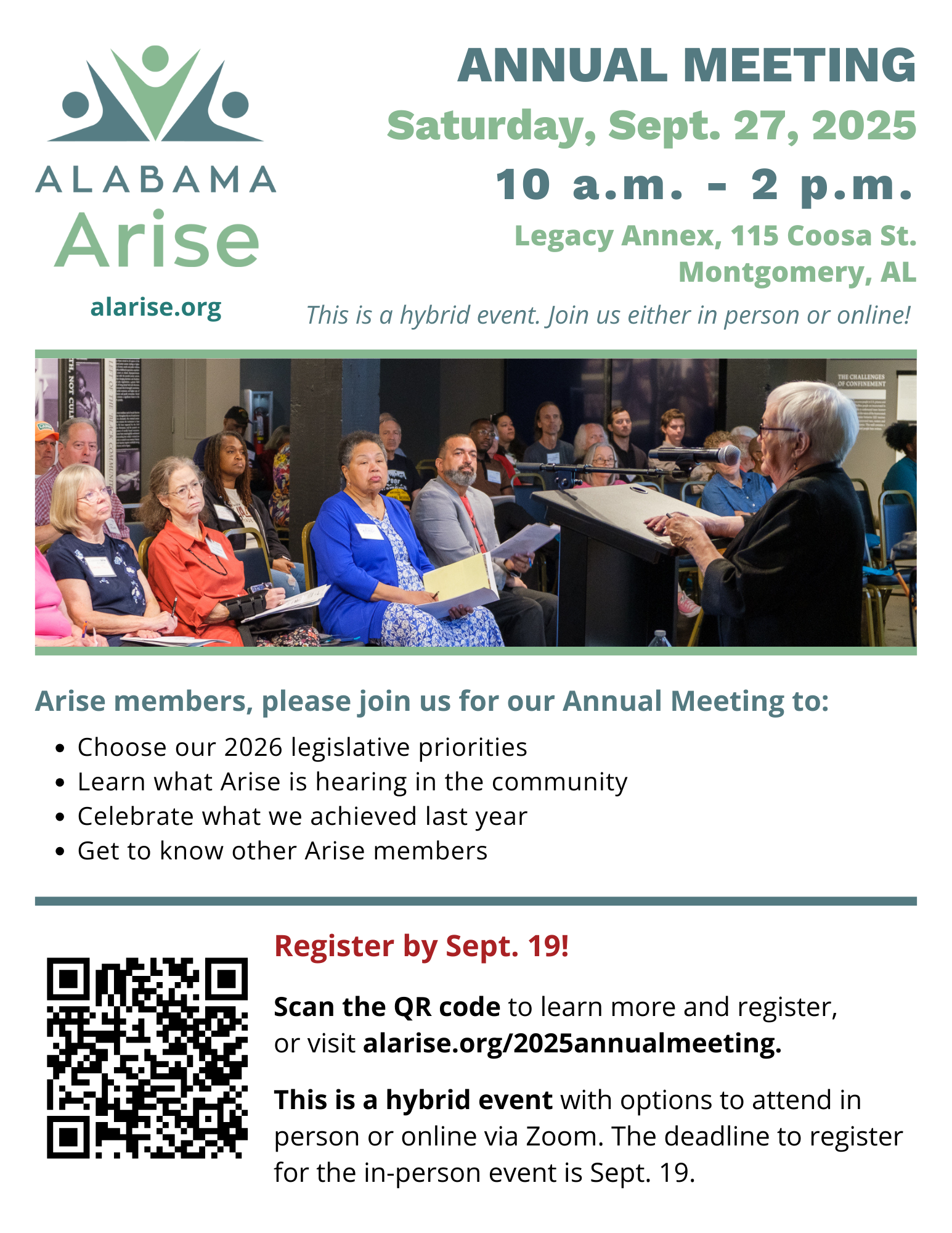 Arise members, join us at the 2025 Alabama Arise Annual Meeting on Sept. 27! Register to join us today!