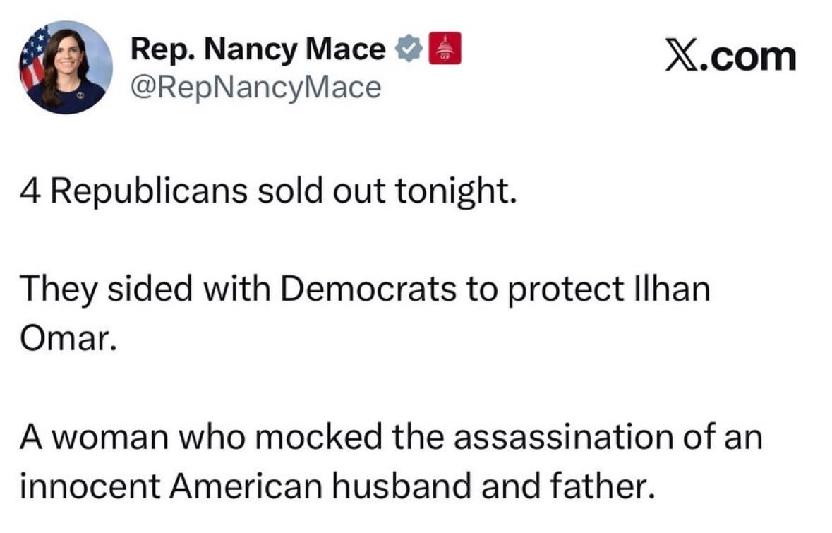 Omar also reposted a video calling Charlie Kirk a “stochastic terrorist” and a “reprehensible human being,” doubling down on her attacks while his family was still planning his memorial. Our resolution would have: - Formally censured Rep. Ilhan Omar before the full House of Representatives.
