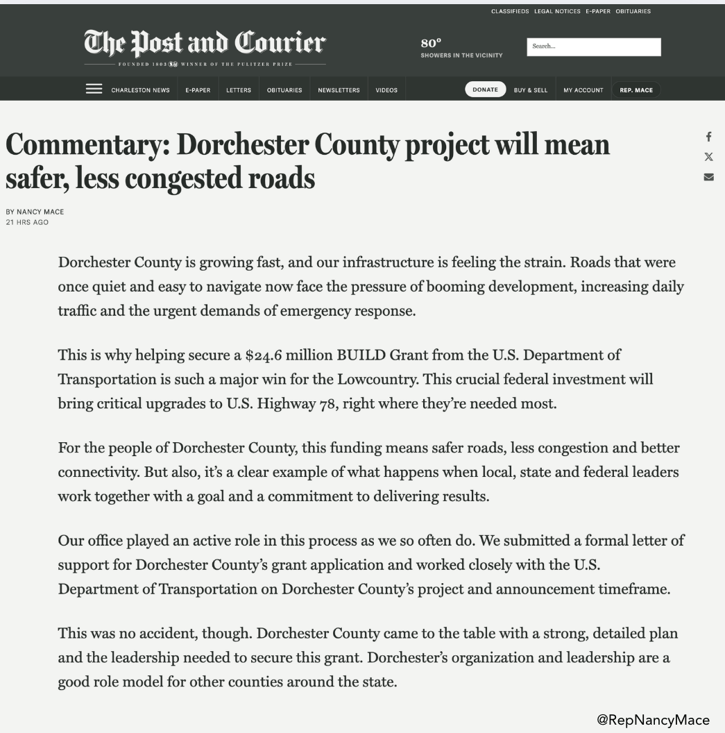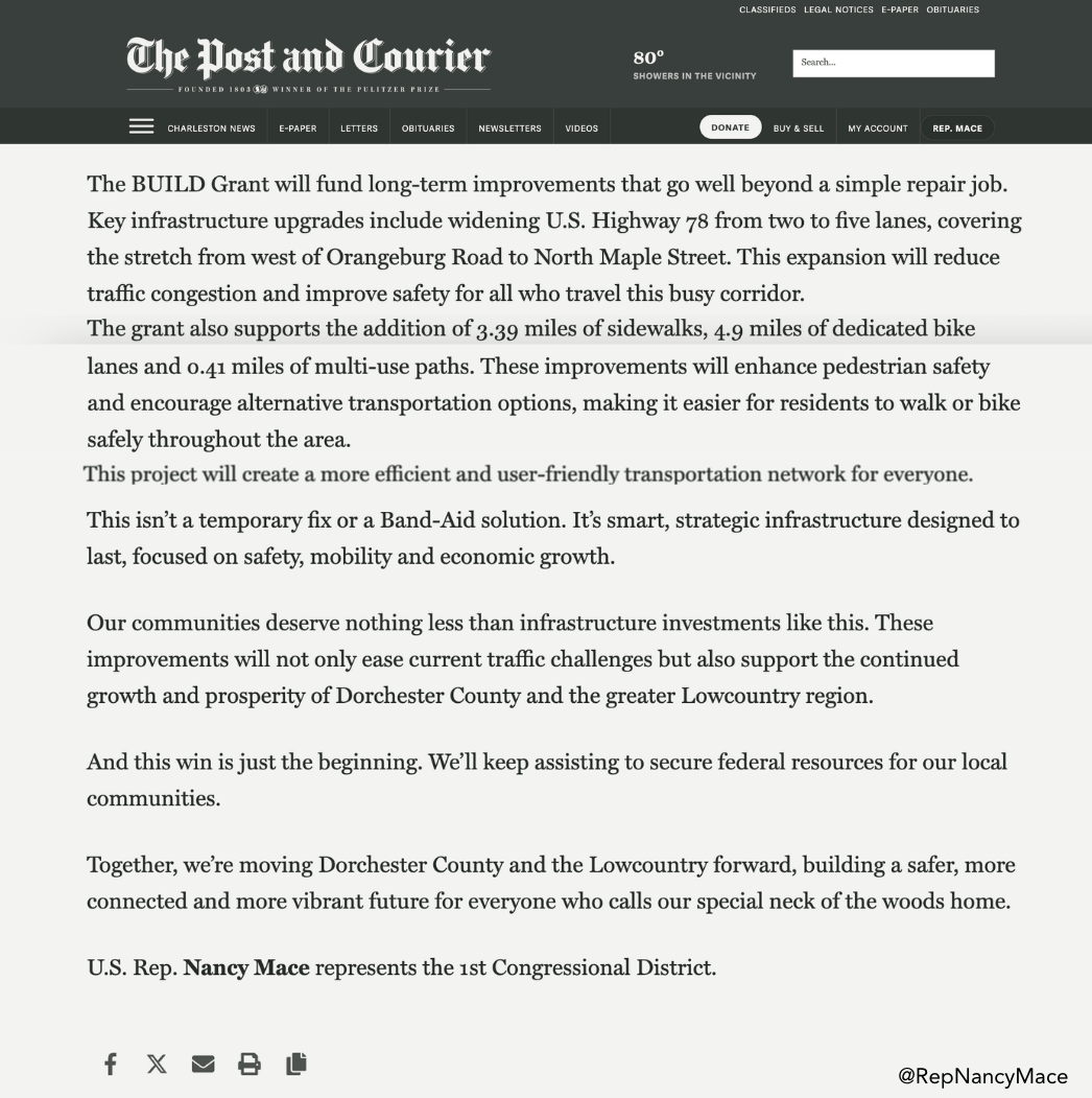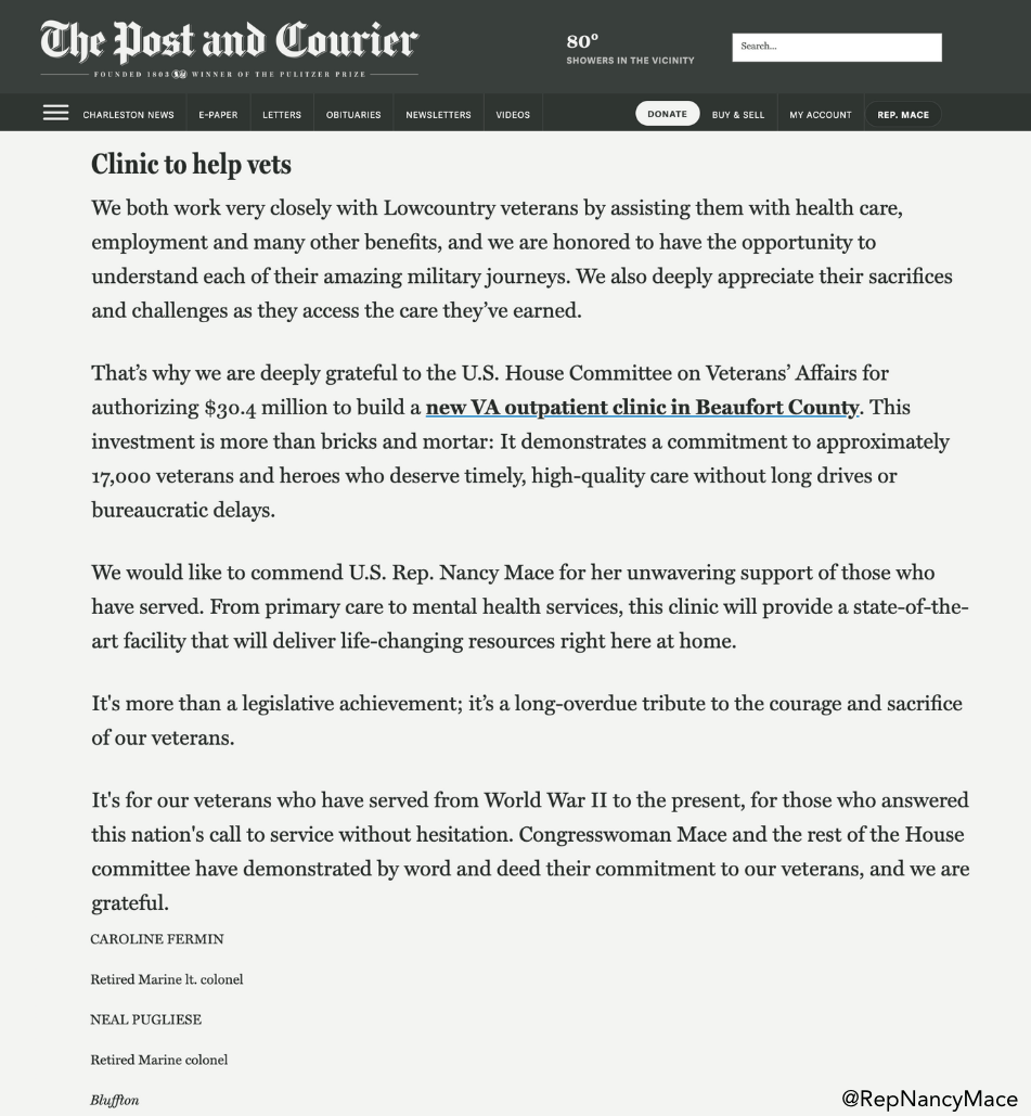 | We pressed Washington, D.C., Mayor Muriel Bowser in a Committee on Oversight and Government Reform hearing on her gender-bender nonsense, racial quotas, and taxpayer-funded activism, which is exactly why we introduced our No DEI in DC Act. | As Chairwoman of the Subcommittee on Cybersecurity, Information Technology, and Government Innovation, we examined how artificial intelligence is transforming healthcare, transportation, and agriculture, and why U.S. leadership is critical. By leading responsibly, we can set standards, protect our values, and ensure AI improves lives here at home. | We introduced the No DEI in DC Act to defund and eliminate the Left’s political machine inside D.C.’s government and bulldoze the DEI offices wasting taxpayer dollars on identity politics. The No DEI in DC Act will dismantle this bloated bureaucracy, defund its political brainwashing mandates, eliminate racial equity training, and advance President Trump’s mission to Make D.C. Safe Again. | We introduced the Government Shutdown Prevention Act of 2025 to end Washington’s cycle of shutdown brinkmanship by removing shutdown threats as leverage and forcing Congress to budget responsibly, without punishing taxpayers, servicemembers, or federal workers. Under this bill, if Congress misses its deadlines, automatic continuing resolutions would keep the government running at 94% of the previous year’s funding level. Every 90 days lawmakers fail to act, funding would decrease by an additional 1%, tightening spending until Congress completes its work. | We were highlighted in the Post and Courier’s latest Letter to the Editor from Retired Marine Lieutenant Colonel Caroline Fermin and Retired Marine Colonel Neal Pugliese, thanking us for supporting the House Committee on Veterans’ Affairs authorization of $30.4 million for a new VA outpatient clinic in Beaufort County. | Live 5 News covered our letter we sent to the U.S. Department of Education following disturbing reports of educators and institutions celebrating or excusing the assassination of Charlie Kirk. We are calling on Secretary of Education Linda McMahon to cut off every dime of federal funding to any elementary, secondary, or post-secondary school who refuses to remove or discipline staff who glorify or justify political violence. | The Post and Courier recently published our op-ed on the $24.6 million U.S. Department of Transportation grant we supported for Dorchester County and the impact this project will have on the Lowcountry. | Breitbart covered an exclusive on one of our new bills, the No DEI in DC Act, which will defund and eliminate the Left’s political machine inside D.C.’s government and bulldoze the DEI offices wasting taxpayer dollars on identity politics. | We sat down with Steve Gruber on Real America’s Voice to talk about our resolution to censure Rep. Ilhan Omar and strip her of all House committee assignments for mocking the assassination of Charlie Kirk, and we also spotlighted President Trump’s success in cracking down on crime. | We spoke with Piers Morgan about the consequences of free speech, our hotline for reporting those glorifying Charlie Kirk’s assassination, and President Trump’s visit to the UK. | Alongside Governor McMaster, we joined Volvo Cars to celebrate 70 years in the U.S., a decade in the Lowcountry, and the launch of a new vehicle which begins their goal of building half of all Volvos in America. SC-01 is the nation’s 10th fastest-growing district, in the 10th fastest-growing state. Growth starts here, driving more jobs, more manufacturing, and more momentum. | We spoke at the SC Chamber of Commerce’s Washington Night in Columbia about cybersecurity, VA modernization, and blockchain, and how these tools can drive South Carolina’s economy and create real opportunity. | We personally thanked the men and women of the South Carolina National Guard serving here in D.C. as part of President Trump’s mission to fight crime and Make America Safe Again. They’re doing an incredible job. South Carolinians are leading the way. | We spoke at Senator Tim Scott's 15th Annual South Carolina Prayer Breakfast, where South Carolinians gathered to lift our state and nation in prayer. In a world of uncertainty, one truth remains: through every trial and burden, God’s goodness stands firm. | We opened the Tunnel to Towers Golf Tournament in Mount Pleasant, supporting a mission dedicated to providing mortgage-free homes for veterans, first responders, and Gold Star families. Their work is vital, as 66,500 veterans call SC-01 home, nearly one in three of all veterans in South Carolina. | 💬 Need help with a federal agency? Contact our district office: 📞 (843) 352-7572 |📍 900 Island Park Drive Suite 260, Daniel Island, SC 29492 | Constituent Spotlight: Samuel Smargissi | Our Constituent Spotlight this week is Samuel Smargissi, who helped bring together the Tunnel to Towers Golf Tournament in Mount Pleasant. His work supports veterans, first responders, and Gold Star families with mortgage-free homes, making a real difference for our community. Thank you, Samuel! | Rep. Nancy Mace Member of Congress | |