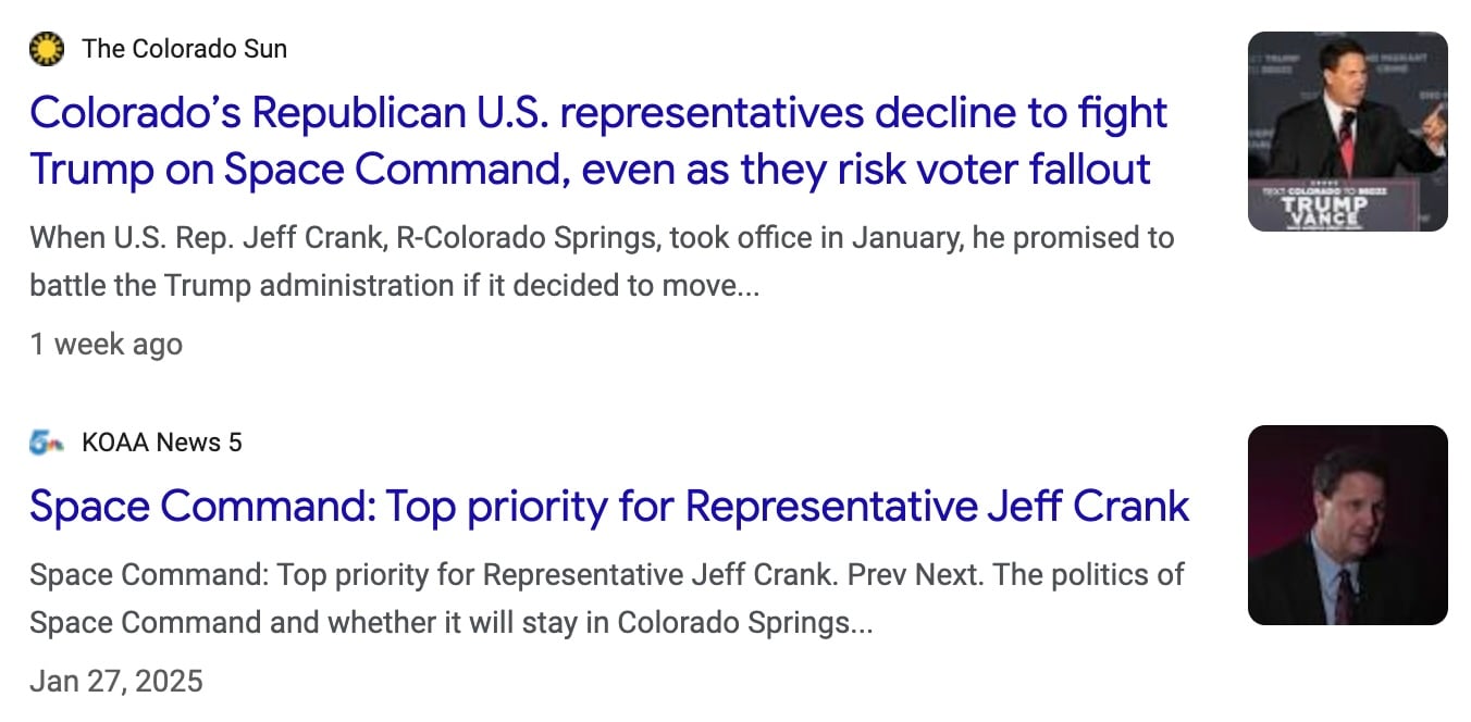 Freshman Rep. Jeff Crank (CO-05), who represents the trending-blue region of Colorado Springs, was elected in part on his promise to fight to keep Space Command in Colorado Springs. He even explicitly vowed in January of this year that “the fight is going to be on” if Donald Trump decided to move Space Command to Alabama.