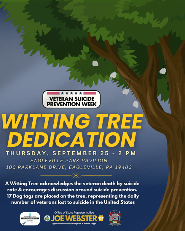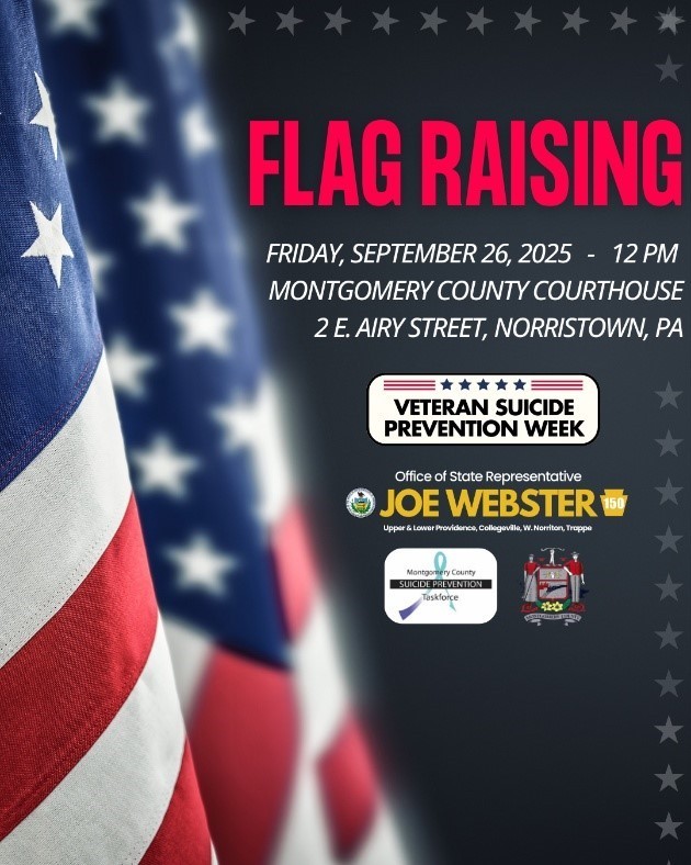 Dear Neighbor, I hope this message finds you well. Below, you’ll find information about the events I’m hosting this week in recognition of Veteran Suicide Prevention Week, an update on upcoming road work in our area, details about the House Fellowship Program application (which closes in one week), and other helpful resources. Be sure to scroll down to the Community Events section to see what’s happening in the district and across Montgomery County! As always, I hope you find the information below useful. | Important Updates/Highlights | Veteran Suicide Prevention Week | Starting tomorrow, September 25, through October 2, I will be recognizing Veteran Suicide Prevention Week in partnership with Montgomery County, the Coatesville VA, and the Montgomery County Suicide Prevention Task Force. Throughout the week, we will host a series of events to honor the veterans we have lost to suicide, including a proclamation, a “Witting Tree” dedication, and a flag-raising ceremony. According to the VA’s National Veteran Suicide Prevention Annual Report (2024), suicide was the 12th leading cause of death among veterans in 2022 (up from 13th in 2021) and the 2nd leading cause of death for veterans under age 45. Each day, 17 veterans die by suicide in the United States, and in Pennsylvania, approximately 250 veterans are lost each year. It is especially important that veterans, their families, and all individuals know what resources are available, including the free 988 Suicide & Crisis Lifeline. We want every veteran to feel supported, acknowledged, and assured that we are here to help. | Tomorrow, September 25, I will be hosting a Witting Tree Dedication for Veterans Suicide Prevention Week at the Eagleville Park Pavilion (100 Parklane Drive, Eagleville), in partnership with Montgomery County, the VA, and the Montgomery Suicide Prevention Taskforce. This event will feature a brief program of speakers on veteran mental health and the placement of 17 dog tags to symbolize the number of veterans lost to suicide each day. It is open to veterans and first responders. The public is invited to view the Witting Tree beginning at 4 p.m. tomorrow and continuing until sundown on Saturday, October 4. The Witting Tree serves as a powerful tribute to raise awareness about veteran suicide and to spark vital conversations on prevention. | On Friday, September 26, at 12 p.m., I will hold a ceremonial United States flag-raising for Veterans Suicide Prevention Week at the Montgomery County Courthouse (2 E. Airy Street, Norristown). This event is open to the public and does not require an RSVP. The ceremony honors Montgomery County veterans lost to suicide and raises awareness of available prevention services. In addition to myself, attendees will include the Montgomery County Commissioners, members of the Pennsylvania General Assembly, county row officers, and staff. Professionals from the VA and the Montgomery County Suicide Prevention Task Force will also be on site to provide resources. | Heads up, neighbors! PennDOT has announced that a lane closure will be in place on Ridge Pike between Germantown Pike and Crosskeys Road for ongoing utility construction, beginning Monday, Sept. 29, and continuing through Wednesday, Dec. 31. The lane closure will be in effect Monday through Saturday from 9 a.m. to 3 p.m. for the duration of the project. Drivers are advised to plan accordingly and practice safe driving habits while crews are at work. | House Fellowship Program Applications | The Pennsylvania House Fellowship Program is now accepting applications for the Spring 2026 semester (January–April). This program is based in the Pennsylvania State Capitol in Harrisburg, and fellows will be assigned to work in House Standing Committees or House Leadership Offices. Qualified applicants include: - College undergraduate juniors or seniors, graduate students, or law school students;