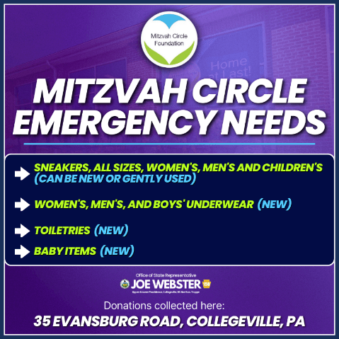 Applications are due next Wednesday, October 1, 2025, and can be emailed to: [email protected] More information can be found at http://www.pahousefellowship.us/ | Mitzvah Circle Foundation, a Montgomery County nonprofit that partners with hundreds of schools, charities, faith groups, agencies, organizations, and individuals to provide relief to families in crisis throughout Southeastern Pennsylvania, recently experienced a fire. A significant number of donations intended for distribution throughout the region were damaged. Members of the PA House and PA Senate have offered to serve as donation drop-off points to help replenish the most immediate critical needs: - Sneakers (all sizes: women’s, men’s, and children’s; new or gently used)