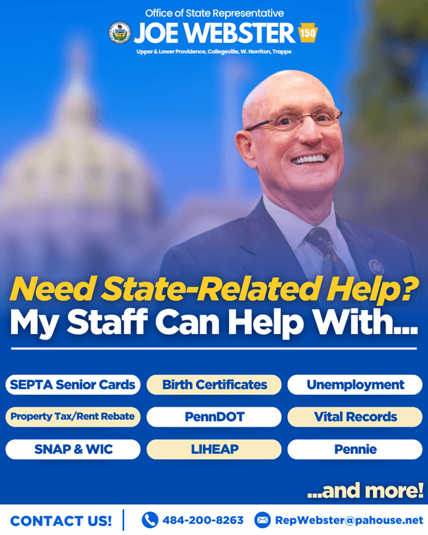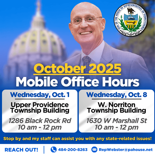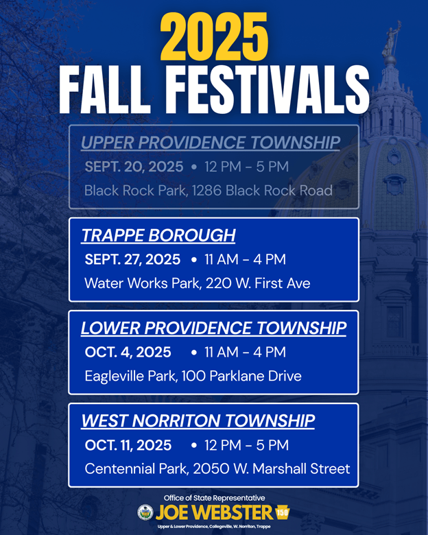 Please contact my office with any questions, and feel free to drop off donations Monday through Friday, 9:30 a.m. to 4:30 p.m., at 35 Evansburg Road. | My staff had a great time at Upper Providence’s Fall Festival last Saturday! Be sure to stop by our booth this Saturday, September 27, at Trappe Borough’s Community Day from 11 a.m. to 4 p.m. Check out the graphic or list below for upcoming fall festivals and community days in our area: Trappe Community Day Saturday, September 27 | 11 a.m. – 4 p.m. Water Works Park, 220 W. First Ave, Trappe, PA Lower Providence 37th Annual Community Fall Festival Saturday, October 4 | 11 a.m. – 4 p.m. Eagleville Park, 100 Parklane Drive, Eagleville, PA West Norriton Annual Fall Festival Saturday, October 11 | 12 p.m. – 5 p.m. Centennial Park, 2050 W. Marshall Street, Jeffersonville, PA | International Underground Railroad Month | September marks International Underground Railroad Month in Pennsylvania, honoring the courageous network of men and women who united to help enslaved people find freedom—a vital chapter in our nation’s history. The graphic above highlights the stories, history, and important events of the Underground Railroad that took place right here in Pennsylvania. | October Mobile Office Hours | If you’re unable to make it to my district office for state-related assistance, my staff is available for mobile office hours on the first and second Wednesday of each month. Check out the September schedule below: Wed., October 1 Upper Providence Township Office 10 a.m. - 12 p.m. Wed., October 8 W. Norriton Township Building 10 a.m. - 12 p.m. | If you’re a senior 65 or older, you can ride SEPTA for free! Stop by my district office at 35 Evansburg Road with a valid form of ID and my staff can help you sign up for a free SEPTA Senior Fare Card. My office hours are Monday through Friday, 9:30 a.m. to 4:30 p.m. | The Victim Services Center of Montgomery County is offering free virtual support groups for Fall 2025. The groups include adult survivors of child sexual abuse (18+), adult survivors of sexual assault (18+), survivors of homicide loss (18+) and young adult survivors of sexual assault (16-24). You can sign up and find out more information by visiting their website at www.victimservicescenter.org/groups | QPR: Suicide Awareness is an upcoming seminar from Upper Providence Township Police Department and Montgomery County Department of Human & Health Services. This free, 18+ program will help you learn skills to identify and help someone showing suicidal warning signs. When: On Thursday, October 23, from 6 p.m. to 8:30 p.m. Where: Upper Providence Township Meeting Hall Register by clicking here | PHEAA is offering more financial aid webinars in September. Check out the list below and click the link to PHEAA’s website to sign up! www.pheaa.org/tools-resources/financial-aid-webinars Searching for Scholarships & Affording the Balance Thursday, September 25, from 6:30 p.m. - 7:30 p.m. Register here | Reminder! The Property Tax/Rent Rebate Program deadline has been extended to December 31, 2025. This program, which is available to older adults and people with disabilities aged 18 or older, provides support to homeowners and renters across Pennsylvania, with rebates ranging from $380 to $1,000. Forms are available for pickup at my district office! If you need assistance completing an application, please call ahead to schedule an appointment. For more information, additional ways to apply, and to check your eligibility, please visit: https://www.pa.gov/agencies/revenue/incentives-credits-and-programs/ptrr.html. | If you need state-related assistance, my office can help you! Please feel free to contact my staff with any questions by calling 484-200-8263 or emailing [email protected] | Tavern Night from Historic Trappe Thursday, September 25, from 5 p.m. - 8 p.m. Dewees Tavern, 301 W. Main Street, Trappe, PA Movie in the Park: Hotel Transylvania from Lower Providence Township Friday, September 26, at 7 p.m. Eagleville Park – Community Lawn, 100 Parklane Drive, Norristown, PA By the Light of the Moon from Upper Schuylkill Valley Park Friday, October 3, at 6:30 p.m. & Saturday, October 4, at 6:30 p.m. 1615 Black Rock Road, Royersford, PA 5th Annual "Fore the Kids” Golf Outing from Coffee Closet with Barista Jake Friday, October 10, from 10 a.m. - 4 p.m. 1615 Black Rock Road, Royersford, PA More information & sign up here: | Please continue to stay safe, healthy, and well-informed. And, if you have questions about any state-related issue, please contact my office at 484-200-8263 or email [email protected]. If you wish to unsubscribe to this email, please scroll to the bottom where it says, “Update Email Preferences.” Sincerely, Rep. Joe Webster State Representative 150th Legislative District | Pennsylvania State Capitol 125-B East Wing P.O. Box 202150 Harrisburg, PA 17120 (717) 787-0419 | District Office 35 Evansburg Road Collegeville, PA 19426 (484) 200-8263 | |