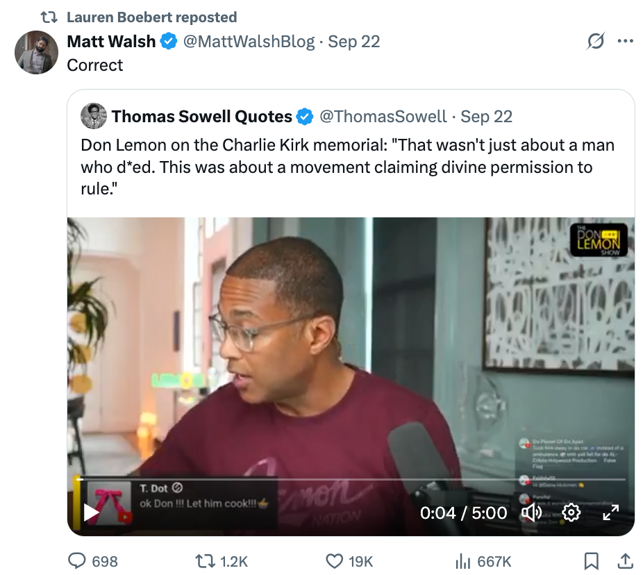 Boebert’s retweet endorsing far-right pundit Matt Walsh’s assertion that the Kirk killing has given the right divine permission to rule as they see fit.