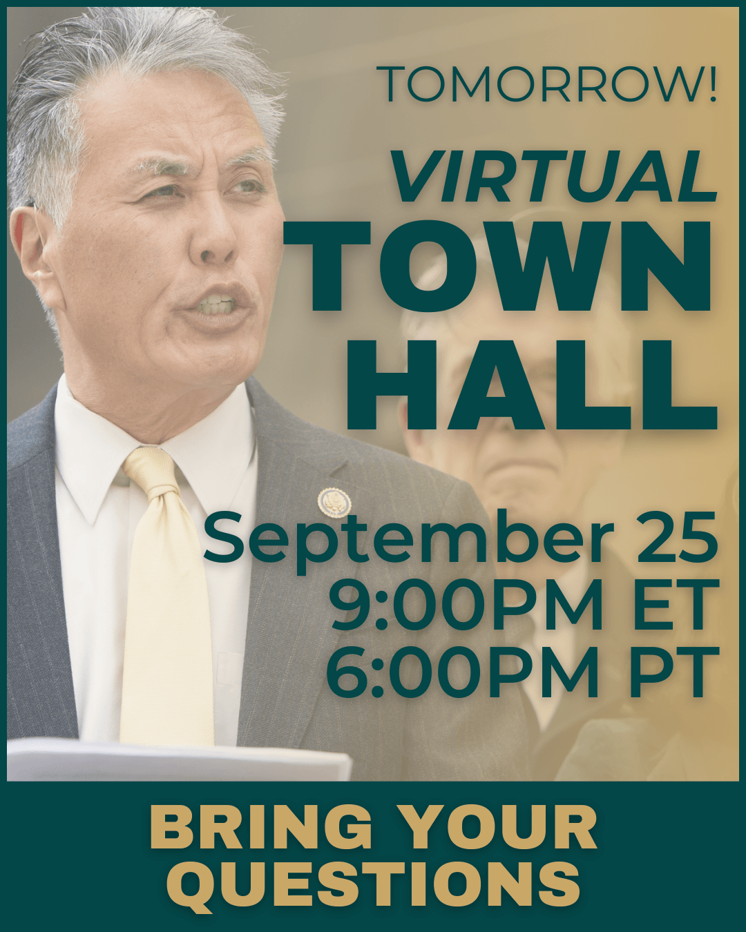 Dear John, Our nation and community are facing serious challenges, ranging the Trump administration attacking 1st Amendment rights to refusing to even meet with Democrats to prevent a government shutdown. Tomorrow, I’m hosting a Town Hall on it all. I want to hear from you directly to answer your questions and hear how this Administration and their policies are impacting you. | There is a lot of information coming out of Washington, and I look forward to answering your questions and to be in community with you all tomorrow evening. As always keep in touch with my office about issues facing you and your family. | Sign up for my newsletter to get updates on this issue and others! | Washington DC 2078 Rayburn House Office Building Washington, DC 20515 p 202.225.2305 f 202.225.7018 | Riverside County 3403 10th Street, Suite 610 Riverside, CA 92501 p 951.222.0203 f 951.222.0217 | |