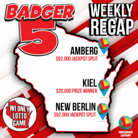 A $92,000 Badger 5 jackpot was split between winning tickets sold at BP in New Berlin and Driftwood Sport and Fuel-Cenex in Amberg for the September 23 drawing.