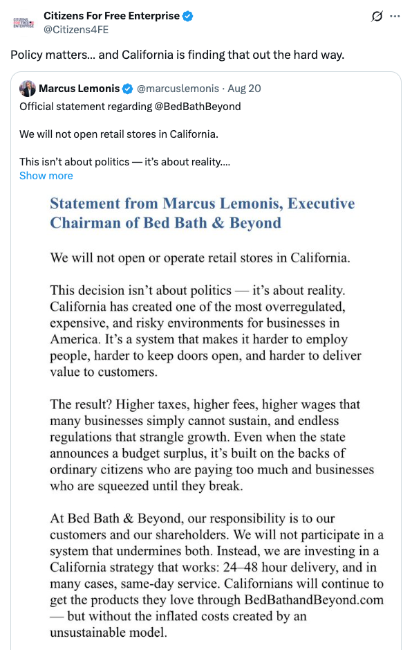 I want to begin by expressing my deepest condolences to the friends and family of Charlie Kirk. Charlie inspired countless young people across the country to love America. His passion for ideas, debate and free speech was infectious. Charlie showed us how we can embrace our differences and prioritize respectful dialogue over political violence. May God rest his soul. The latest NAEP scores showed us that not onlu is K-12 public education not improving, it's declining. The scores indicate that a third of high-school seniors lack basic reading skills and nearly half can’t do rudimentary math. Compared to 2019, students performed worse on all three exams; math, science, and reading. I'm not anti-public schools, but I am pro-school choice. It's clear that the one-size-fits-all public school strategy isn't working -- that's why school choice is so important. Families deserve options so they can choose the best education that fits their child's unique needs. We got another reminder that state policy matters. Bed Bath and Beyond announced that they would no longer be opening stores in California. Marcus Lemonis, Executive Chairman of Bed Bath & Beyond, issued a statement citing the state’s high taxes and regulations as the driving factor behind the decision, writing: “This decision isn’t about politics — it’s about reality. California has created one of the most overregulated, expensive, and risky environments for businesses in America. It’s a system that makes it harder to employ people, harder to keep doors open, and harder to deliver value to customers.” I'm happy to report that Arizona does not have that problem. More Communist Confusion and Delusion Also, I encourage everyone to check out this clip from Jesse Watters' show on Fox News. One of their reporters snuck into a Zohran Mamdani rally in New York City to hear directly from the socialists what they are expecting out of a socialist administration. Long story short: A lot more free stuff for them -- and YOU are going to be footing the bill. Citizens for Free Enterprise CEO & 23rd Governor of Arizona Paid for jointly by Citizens for Free Enterprise and Citizens for Free Enterprise Action. Citizens for Free Enterprise and Citizens for Free Enterprise Action are separate and distinct organizations. Not paid for by any candidate or candidate's committee. To unsubscribe from Citizens For Free Enterprise, click here