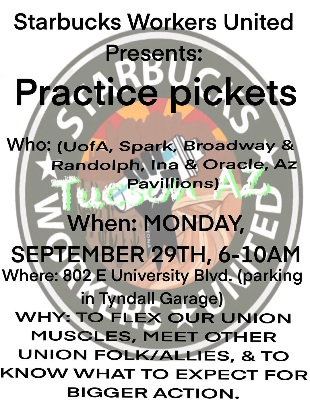 Starbucks Workers United Workers in Arizona are asking for your support. This weekend, Starbucks is closing 600 stores and putting Baristas and other Starbucks Workers on the street. We're fighting back! Please join us for a Practice Picket in Tucson on Monday 9/29 to show the company that we will not back down. The company has stalled on contract negotiations for one year. It would take one day of National Sales to settle our contract. Yet, the Company chooses to pay the CEO 6,666 more than the average worker, close stores, and put workers on the street. We are prepared to strike if we have to. Please find the attached flyer to share with your networks.