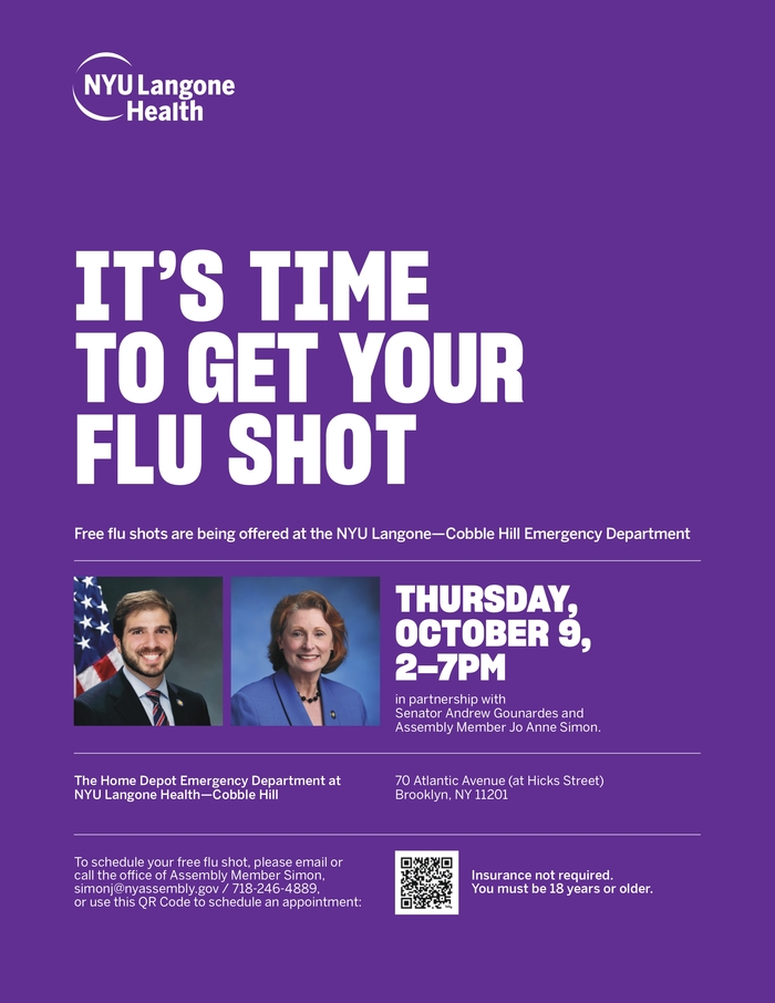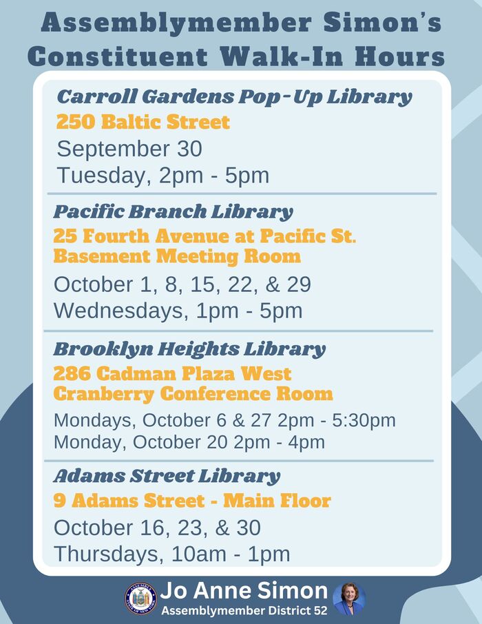 Dear Neighbors & Friends, I’m sending my best wishes to students and families for a successful school year ahead. Thank you to everyone who participated in our local school supply drives. Shout out to Gowanus Mutual Aid, Camp Friendship in Park Slope, Warren Street Houses, Fifth Avenue Committee and Joe Anne Brown for their local events - and many more. It’s inspiring to see our community come together and help students start their year off on the right foot. I am thrilled that there will be free school meals for all students starting this school year - every student is eligible for breakfast, lunch, and after-school meals. I pushed for this initiative for many years, alongside New York’s student and nutrition advocates. As you may be aware, there is also a New Cellphone & Electronic Device Policy: students must turn off and store all personal internet-enabled devices (smartphones, tablets, smartwatches, etc.) from the first bell to the last bell. Please join me and your neighbors for a cup of coffee at my next "Java with Jo Anne” in Boerum Hill, Mon. Sept. 29, 9:30 AM. This is a chance to discuss community issues or current events, and to get to know my staff and your neighbors. We will gather at Squarrel Cafe, 572 Atlantic Ave, in Boerum Hill. Please RSVP here or call my office at 718-246-4889 with any questions. We would also greatly appreciate your feedback on our Java with Jo Anne events. For example - when is the best time for you to make it to Java? Is there a topic you would like to see covered? Please fill out this brief feedback form. Sincerely, Jo Anne Simon P.S. Shana Tova U'metuka! Wishing all who celebrated Rosh Hashanah a happy, healthy, and sweet new year filled with love, growth, and sweet beginnings. Get Your Free Flu Shot on Oct. 9th. I am again partnering with NYU Langone Health and Senator Gounardes to provide free flu shots to the community on Thursday, October 9th, from 2:30pm - 7pm, at the Cobble Hill ED, 70 Atlantic Ave. Insurance is not required. Please make an appointment and register here. COVID-19 Vaccine Guidance: As autumn arrives, New York is recommending everyone get their COVID-19 and flu vaccines. While the federal government is attacking science and restricting access to health care, New York is following the research and putting residents’ health first. Vaccines are safe, effective, and the best way to protect yourself, your family and your community. The Governor recently signed an Executive Order to ensure all New Yorkers can receive the updated Covid vaccine without a prescription. The Executive Order declares an emergency that overrides recent federal actions restricting vaccine access. Learn more here. You can get the Covid vaccine for free with no co-pays regardless of immigration or health insurance status through NYC Health+Hospitals and other health centers; if you have insurance, your insurance will be billed. Find a local pharmacy or site near you that is administering the vaccine or call 1-844-NYC-4NYC (1-844-692-4692). Some sites are still waiting for the updated Covid vaccine, so check before you go. Upcoming Constituent Service Events. You can meet with my staff at our upcoming office hours at libraries across the district. We can help you navigate benefits, connect with various government agencies, or help you with questions about local issues. Come by and chat with my team. My No Vote on the Brooklyn Marine Terminal Plan. You may have seen the news that Mayor Eric Adam’s plan for the Brooklyn Marine Terminal (BMT) will move forward, after Monday’s last-minute Task Force vote (17 in support, 8 opposed). I voted against the plan. When the NYC Economic Development Corporation (EDC) took over the BMT from the Port Authority, they said they would transform the BMT into “a harbor of the future” with manufacturing jobs, maritime opportunities, and economic development. This was lost early on, as EDC quickly seized upon luxury housing to pay for the port. They didn’t really consider anything else. There was only ever one proposal from EDC – which was modified and improved upon by myself and the other Task Force members – but no genuine analysis of alternatives, or exploration of the immense possibilities that the site could offer, or of the serious engineering constraints of the site. The Task Force was supposed to engage local stakeholders, yet the community most directly impacted – Columbia Street Waterfront – was excluded. A red flag, but I nevertheless entered this process in good faith, a strong proponent of an environmentally just working waterfront of maritime uses at one of the last remaining ports in the City. I was enthusiastic about playing a constructive role in this process to achieve those ends. That’s why I am terribly disappointed that this process was rushed from the start, constrained by an artificial timeline, heavy-handed, and mired in backroom deals. I also want to comment on the disheartening lack of courtesy, transparency and meaningful community engagement in this process. Throughout this process the community engagement was minimal and appeared to be done so the EDC could check a box saying they had “X” number of meetings. But when most of the people there are EDC staff, consultants, and elected officials and their staff, the affected communities haven’t been engaged. The final meeting was sprung on us last-minute for an obviously non-existent reason about the City’s capital budget deadline (which is modified quarterly), but in reality was scheduled because two of the voting members had flipped to yes and the EDC finally had the votes they needed after 5 postponements. A revised plan — which failed to address the fundamental flaws — emerged last Thursday without any conversation or review. Task Force members were instructed that there would be no more changes to the plan and no community review; this flies in the face of a democratic process. The BMT is in a highly congested t