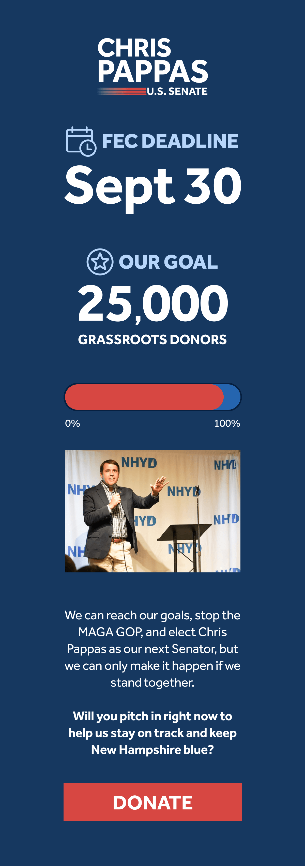 New Hampshire is poised to be one of the closest Senate races in the country in 2026. Will you chip in today to help Chris stop the Republicans from flipping the Granite State red and expanding their Senate majority?