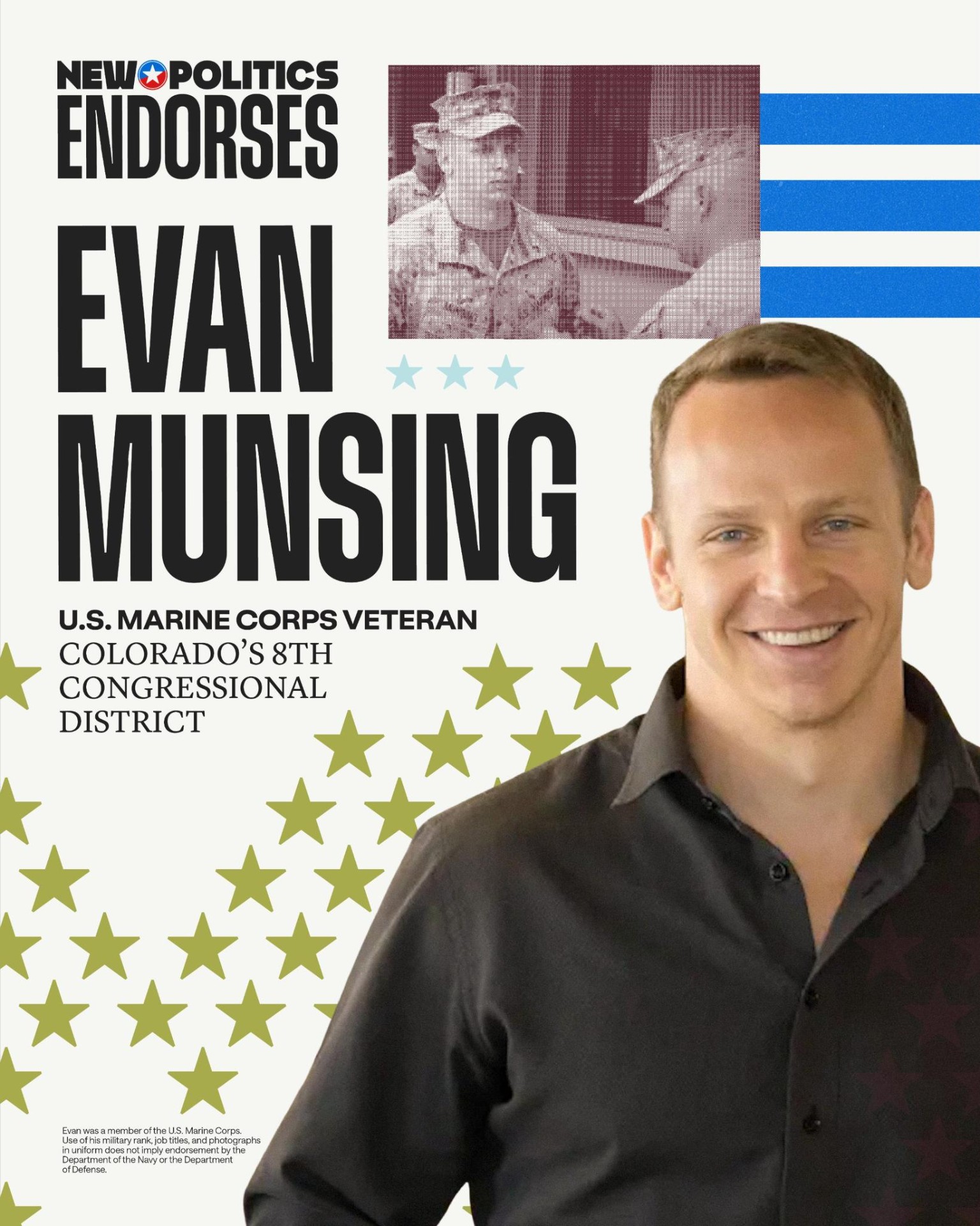 A few quick updates, friends: In just the last few weeks, Evan Munsing earned the endorsement from New Politics and the Unrig Washington designation from End Citizens United.  Meanwhile, polls show our opponent, Rep. Gabe Evans' support is shrinking. More Coloradans are turning away from him as he continues to be President Trump’s number one “Yes-man.” Our end-of-quarter FEC deadline is quickly approaching next Tuesday, and we have a chance to turn this momentum into a breakthrough moment. The differences between Evan Munsing and Gabe Evans couldn't be clearer. Contribute $10 or more toward our team’s $30,000 fundraising goal to prove that we have a clear path to victory » Let’s show them what this team can do! Evan Munsing for CO-8 Evan Munsing is not a politician. He's a Marine, a business leader, and a fighter. He's fought real battles in real war zones, and he knows what it means to lead under pressure. WEBSITE >>> CONTRIBUTE $25 >>> Paid by Evan Munsing for Congress |