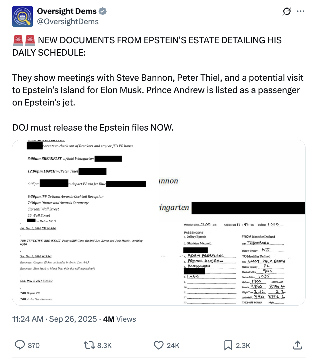These files show meetings with convicted felon and extremist MAGA strategist–turned–podcaster Steve Bannon, billionaire Peter Thiel, and even a potential visit to Epstein’s Island by Elon Musk.