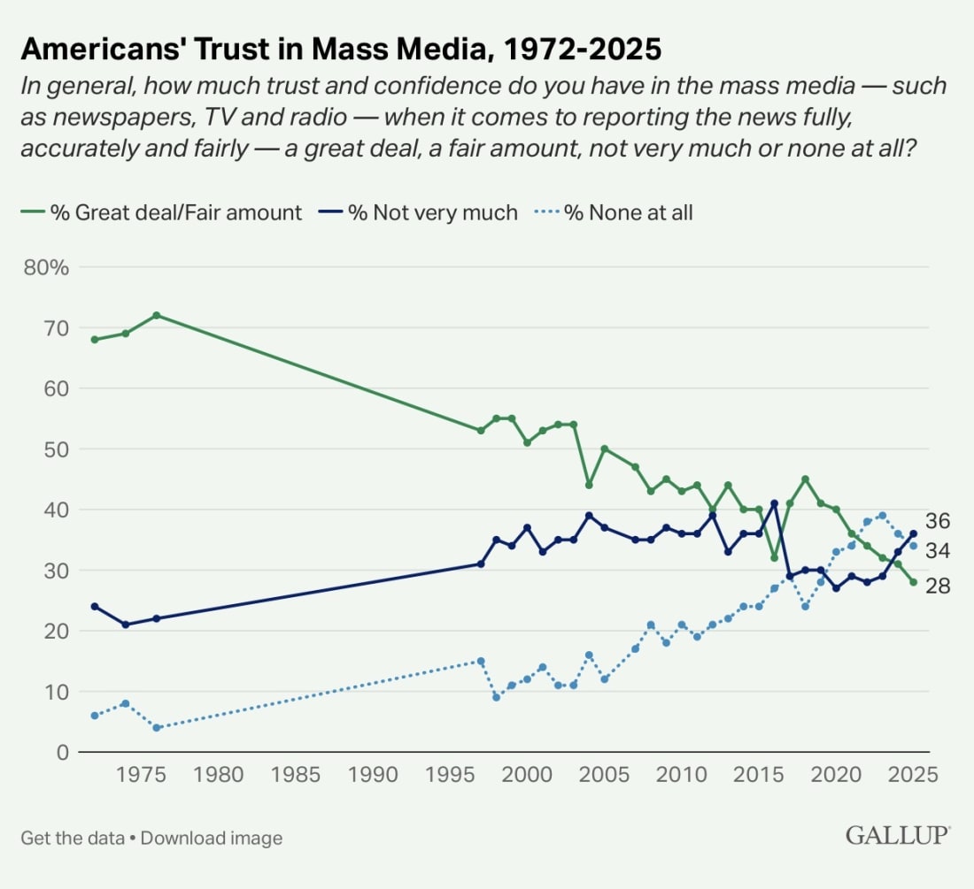 Thank you for being a free subscriber to So, Does It Matter? Please support what we do. And also get 100% of our content (right now you get about 60% of it!). In fact if you upgrade now, you break through the paywall at the bottom of THIS post! *Breaking News* New Survey Shows That Nearly 7 in 10 Americans No Longer Trust The News MediaGallup now finds just 28% of Americans trust the mass media — a new low — with about 7 in 10 saying they have “not very much” or “no trust at all.”⏱️ 4.5 min read Media Trust Reaches a Record LowGallup’s latest reading shows confidence in newspapers, television, and radio has fallen to 28%, the first time the measure has slipped below 30%. Meanwhile, 36% of Americans say they have “not very much” confidence, and 34% say “none at all.” Combined, roughly seven in ten Americans lack meaningful trust in mainstream media. This isn’t just a recent dip. For decades, trust has slid steadily. Today’s 28% is not an anomaly — it’s the new floor. Our afternoon columns are mostly for our paid subscribers…This is only the surface. Subscribers get the deeper dive: the most revealing charts from Gallup’s latest survey (and from another Pew survey) a look at how Democrats, Republicans, and Independents are diverging, and my take on why younger Americans are abandoning traditional outlets. And of course, what this shift means for anyone who still cares about accountability. Upgrade now to get a lot of value, and support my independent writing. And of course to read this really interesting post below!... Keep reading with a 7-day free trialSubscribe to So, Does It Matter? California Politics! to keep reading this post and get 7 days of free access to the full post archives. A subscription gets you: