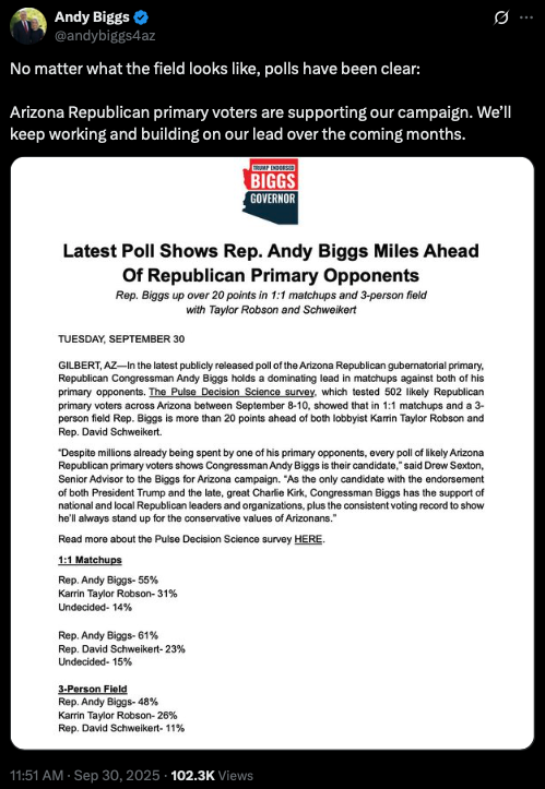 This comes after Congressman David Schweikert decided to enter the race. The poll shows that whether it's a head-to-head matchup, or it's a three-way race, Biggs wins decisively.