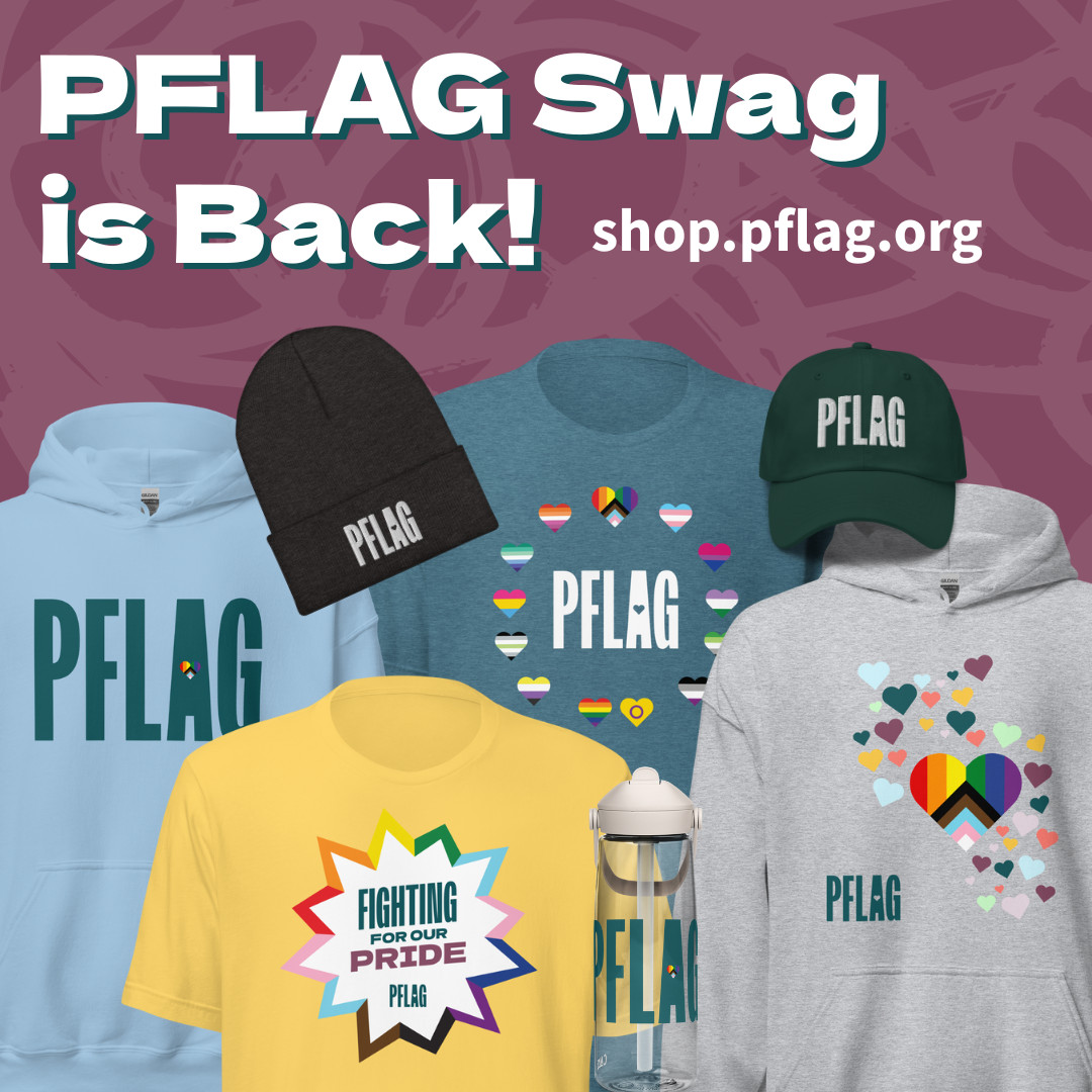 | Get your PFLAG swag—t-shirts, hoodies, hats, and so much more—and show you're proud to be part of PFLAG all year long. Visit shop.pflag.org to place an order. 100% of the proceeds support our important work of ensuring every LGBTQ+ person is safe, celebrated, empowered, and loved. |