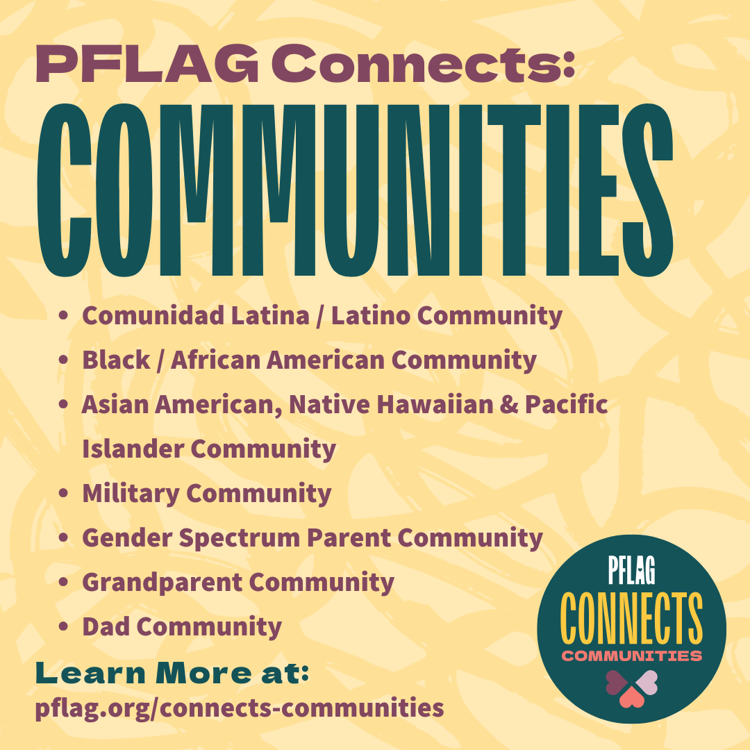 | Every month, our PFLAG Connects: Communities meet for safe, moderated, virtual meetings to seek guidance, ask questions, and learn from others who have been through similar experiences. Our current community offerings gather people of Latino, Black/African American, AANHPI (Asian American, Native Hawaiian, and Pacific Islander) backgrounds, as well as military families (a program in partnership with Modern Military), families with gender-diverse loved ones, dads, and grandparents! Check out the November PFLAG Connects: Communities meeting times at pflag.org/connects-communities. |