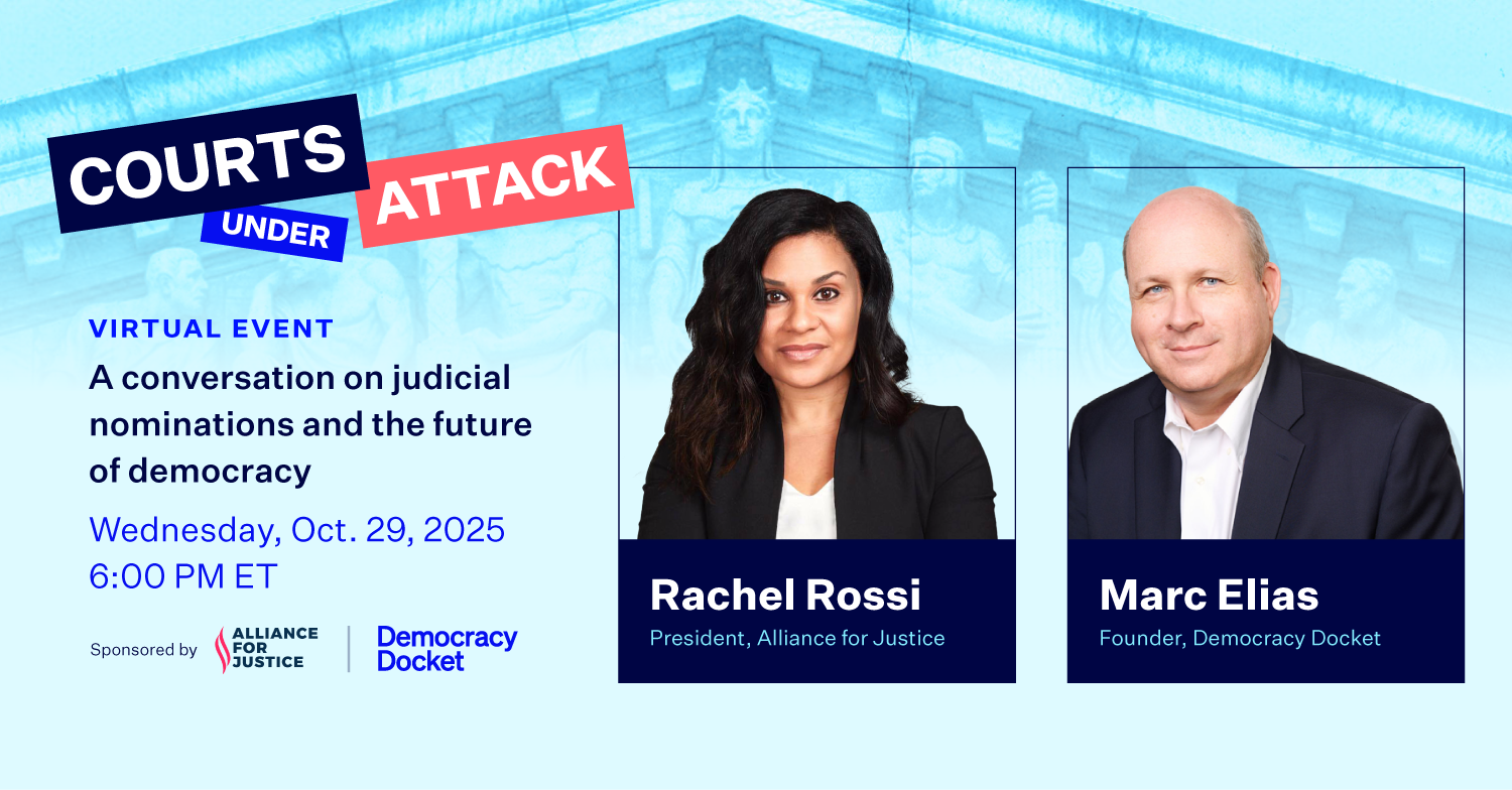 Please join Alliance for Justice and Democracy Docket TODAY, Wednesday, October 29, 2025, at 6 PM ET for our virtual event: Courts Under Attack: Judicial Nominations and the Future of Democracy.This conversation will feature AFJ President Rachel Rossi and Democracy Docket founder Marc Elias.