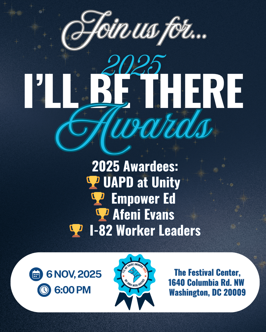 It's time to celebrate! Join the DC Jobs With Justice community for a warm evening together at the I'll Be There Awards.