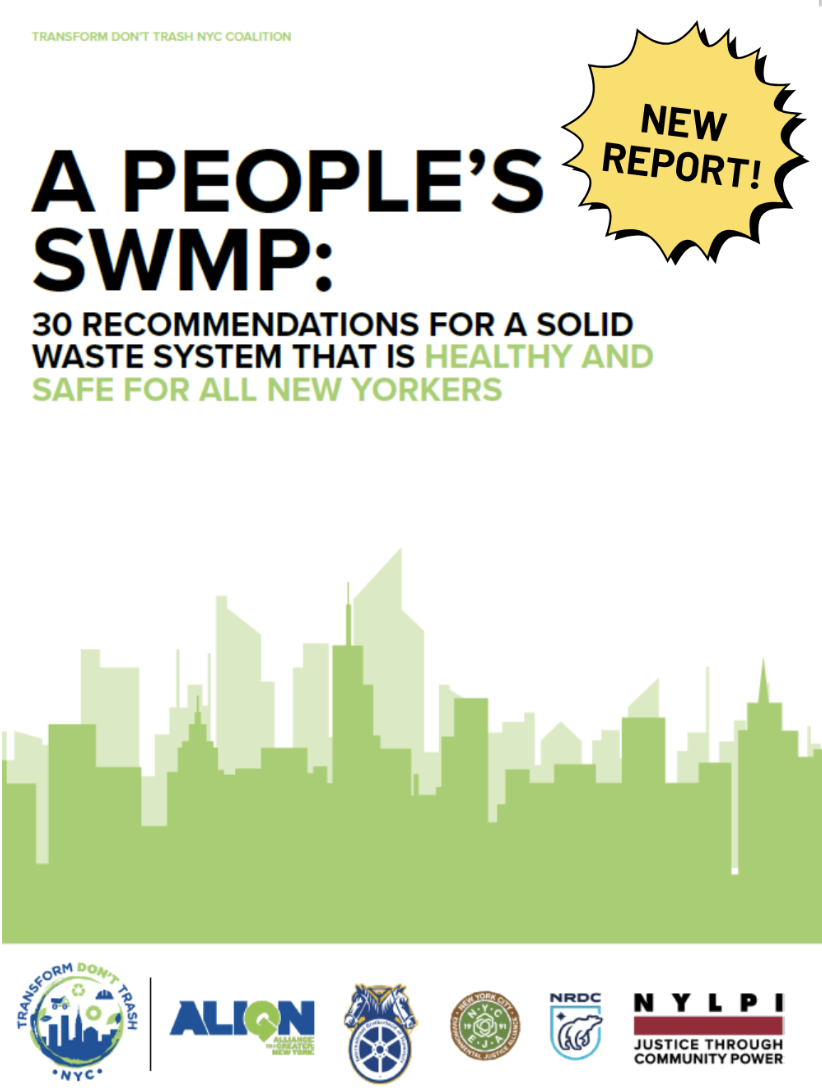 Fourteen million tons of waste is generated every year in NYC, affecting communities, workers, and the environment. Right now, New York City has inefficient waste and compost systems, too many polluting trucks causing havoc in our neighborhoods, and lack of community input in program development. We need to make sure our waste system is done right. The City is developing a new Solid Waste Management (SWMP) plan which will outline how our waste system will function for the next 10 years. In response, grassroots community organizations and labor unions from the Transform Don’t Trash coalition put together a new report “A People’s SWMP: 30 Recommendations for a Solid Waste System That is Healthy and Safe for All New Yorkers”. Our recommendations will transform our waste system to achieve waste equity, improve recycling programs and waste reduction, decrease truck pollution, and increase community participation.