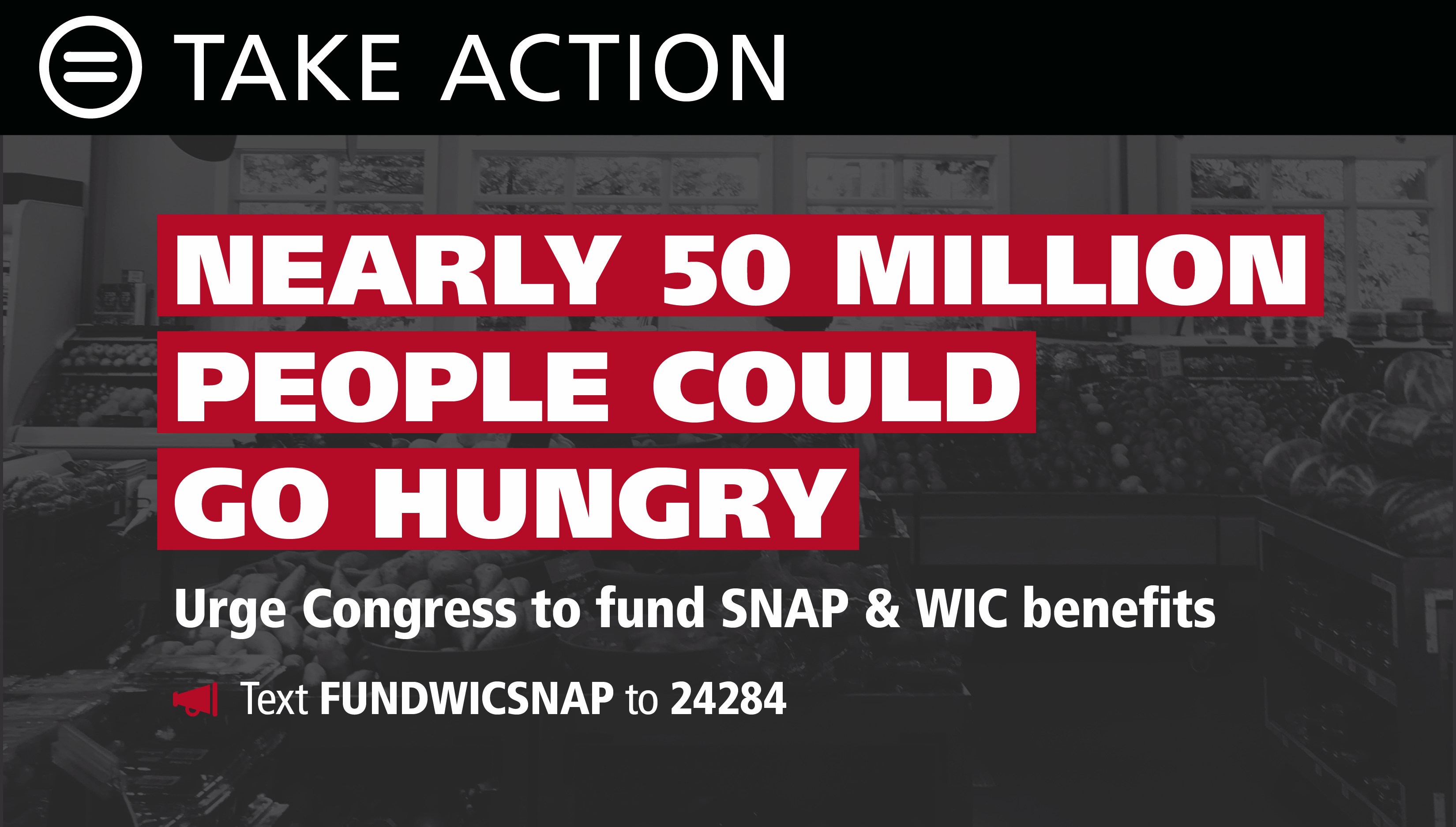 Hunger cannot wait. Millions of families are at risk of losing access to food assistance as the government shutdown deepens. Urge Congress to act now. |