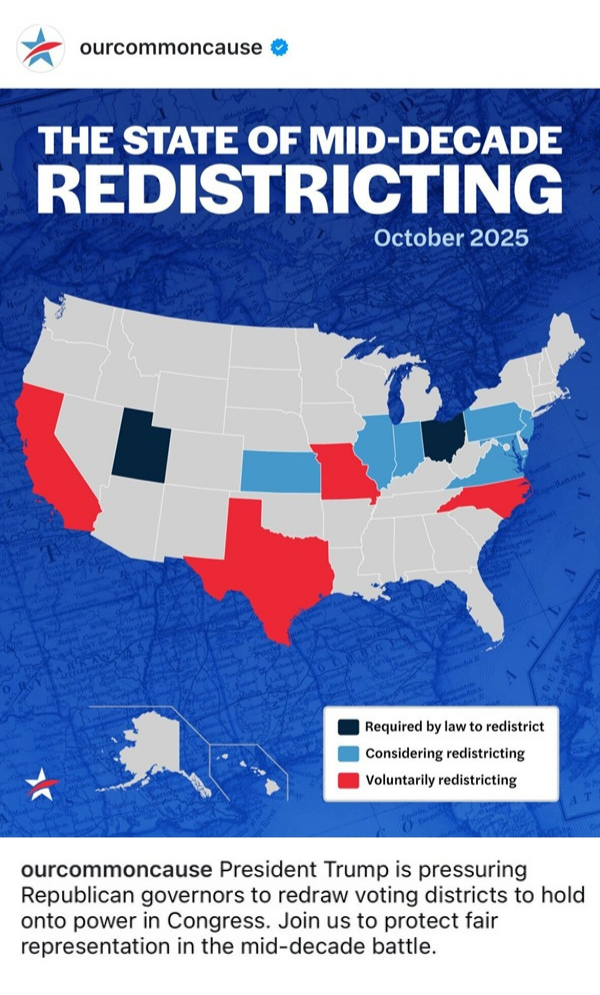 Indiana: After weeks of heavy pressure and multiple visits from the White House, Governor Braun caved to the Trump administration and announced he’ll hold a special session to force new voting maps.