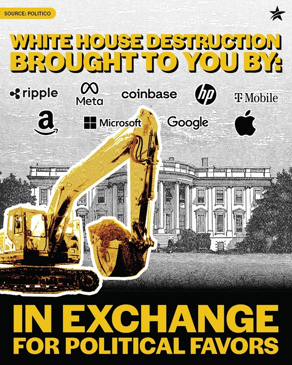 The White House belongs to the people — not President Trump or his megadonors. Yet, he’s tearing down the East Wing to build a $300 million ballroom funded by Google, Apple, and Amazon.