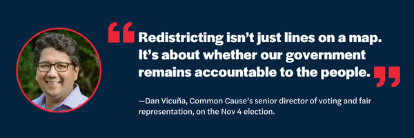 Tuesday, November 4th is Election Day. Across the nation, Common Cause experts and volunteers are on call helping voters navigate election processes in their states, answering questions, dispelling misinformation, and empowering the people to make their voices heard. Notably, California will be voting on Prop 50 — a measure that will dictate the balance of power in Congress ahead of next year’s midterm election.