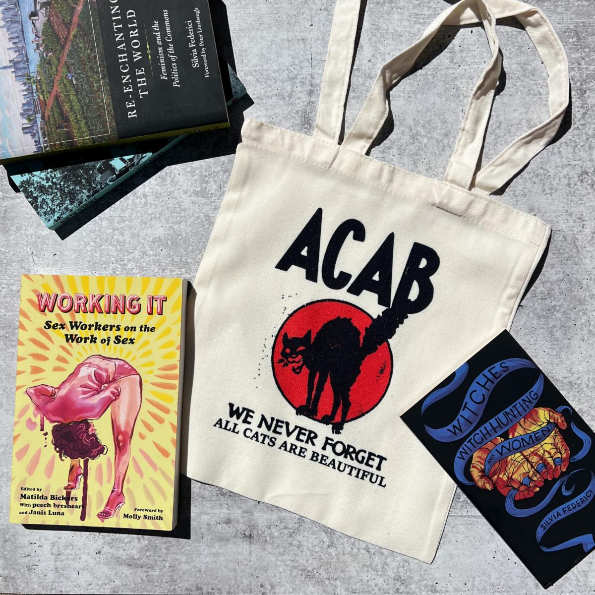 Tote designs include: ACAB or General Strike (English, Spanish, or Arabic).