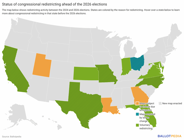 California became the fifth state to redraw its congressional districts ahead of the 2026 elections after voters approved Proposition 50 on Nov. 4. The new map makes five districts more favorable to Democrats according to 2024 presidential results. That could lower the net gains from redistricting in Republican-led states from nine districts to four nationwide.