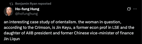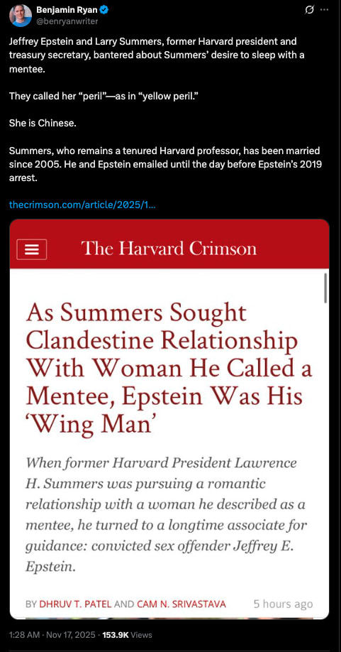 The Scandal Deepens: The Harvard Crimson alleges that the woman being discussed by the two men is Keyu Jin, a macroeconomist tenured professor at the London School of Economics and that Jin’s father is “a former high-ranked Chinese Communist Party official and the founding president of the Asian Infrastructure Investment Bank, who Summers had long been close with.“
