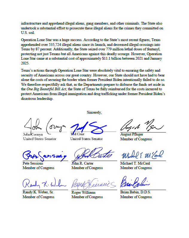 This week, I joined Senators Cornyn and Cruz in sending a letter to Attorney General Pam Bondi and Homeland Security Secretary Kristi Noem, advocating for Texas to be reimbursed for the costs incurred to secure the border during the Biden-Harris administration. Texas invested over $13 billion to combat President Biden's refusal to enforce immigration laws, which resulted in 1.7 million aliens illegally entering the country.