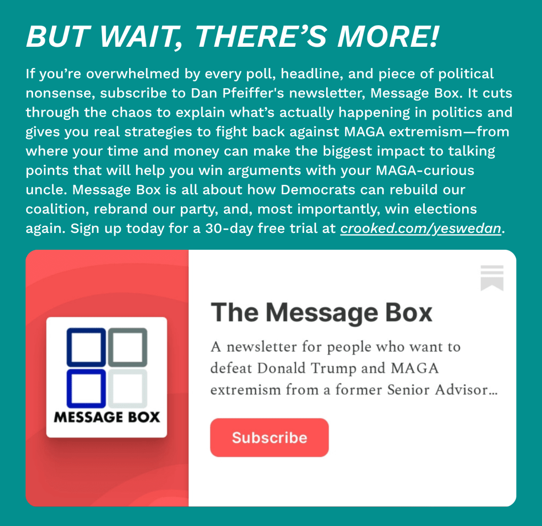 The odds may be stacked against Mamdani. But he’s seemingly in good spirits, posting a smiling selfie from his flight to the nation’s capital. WHAT ELSE?Epstein confidant Ghislaine Maxwell is getting special privileges in prison, such as extra toilet paper, after the Trump administration moved her to a cozier prison facility, according to emails obtained by the Atlantic reports. The convicted sex trafficker is apparently in such good spirits that she regularly uses upbeat phrases while talking with her family, including “yippe skipee” regarding her brother’s planned visit, and “I hear you are a media star!” to a sibling who defended her publicly. Now why would she be getting perks, after declaring Trump “a gentleman in all respects?” Pure coincidence, I’m sure. The White House wants to serve Ukraine to Russia for Thanksgiving. It’s pushing Kyiv to agree to cede Ukrainian territory to Russia by next week’s holiday, or say goodbye to U.S. support, the Washington Post reports. The so-called peace plan is “pure Russian,” a European diplomat told the outlet. Trump confirmed the Thanksgiving deadline today. The Coast Guard issued a new order classifying swastikas and nooses as hate symbols, according to the Washington Post, after the outlet reported that the symbols were planned to be reclassified as merely “politically divisive.” Weird that the Coast Guard had to clarify their stance on, uh, swastikas, but these are strange times! Supporters of HHS Secretary Robert F. Kennedy Jr. are laying the groundwork for the brainworm survivor to run for president again. It’s still far from certain whether RFK Jr. would wanna launch another longshot bid. Organizers of the 2028 Olympics are seemingly appealing to Trump: Most of the members on its board of directors have direct ties to the president. A few examples: Former Trump Chief of Staff Reince Priebus, former House Speaker Kevin McCarthy, and people who have donated boatloads to his political operations. What’s next, Trump lights the torch at the opening ceremony? Only 12 percent of Americans believe that billionaires have a positive impact on society, according to a survey. I asked Grok, Elon Musk’s AI chatbot, if people would dislike him even more if he becomes a trillionaire: “If Musk hits $1T (projections: by 2027-2030), expect a backlash wave—more protests, ‘tax Elon’ campaigns, and memes painting him as a Bond villain.” Good ideas, Grok! MAGA Rep. Cory Mills (R-FL) was caught with sex workers in Tbilisi, Georgia while he was running for Congress, NOTUS reports. (Mills’ office didn’t respond to a request for comment from the outlet.) This is just the latest eye-popping scandal for Mills. Seriously, how do these people get elected in the first place? Cryptocurrency is plummeting, erasing some $400 billion in value. “The bloodbath has left no corner of the market untouched, and is reviving the debate about crypto as a long-term asset,” Axios writes. So yes, you were right to advise your hypebeast cousin against putting his life savings into Fartcoin. The Fugees’s Prakazrel “Pras” Michel was sentenced to 14 years in prison after being convicted of illegally funnelling millions million in foreign donations to Barack Obama’s reelection campaign in 2012. LIGHT AT THE END OF THE EMAIL…That good ol’ Mary Jane is taking over Thanksgiving, according to the Wall Street Journal. The marijuana industry is taking advantage of looser restrictions in many states, with an eye toward products for turkey day. “This year, don’t be surprised if Grandma gets a little loopy after toasting with a cannabis-infused beverage in her wine glass, or your aunt brings two varieties of stuffing — one made with pot-laced rosemary oil, one without,” the outlet writes. Great, the Journal wants your family to know you totally got high on that “walk with your cousin” you took right before stuffing your face with mashed potatoes. Thanks a lot, WSJ! Vanity Fair got an exclusive look at never-before-seen wedding pictures of Zohran Mamdani and Rama Duwaji, New York City’s newest power couple. “It’s crazy to think if we tried to do this today — because we can’t go anywhere with this guy,” the photographer said, nodding to Mamdani’s incredible popularity in the city. Fátima Bosch Fernández of Mexico won Miss Universe 2025, a remarkable turn of events after she was publicly scolded by one of the judges. After the win, Fernández told reporters that she would like to be “a person that changed a little bit the prototype of what is a Miss Universe and a real person that gives the heart.” Archaeologists in Hungary discovered an unsealed a Roman sarcophagus from 1,700 years ago — containing the complete skeleton of a young woman, surrounded by coins, bronze figures, and fully intact glass vessels. Daniel Radcliffe, aka the OG Harry Potter, wrote a letter to the new kid playing Harry Potter in HBO’s reboot. “I do not want to be like a specter in the lives of these children at all,” Radcliffe said. “I just wanted to write to him to say, ‘I hope you have the best time, and an even better time than I did. I had a great time, but I hope you have an even better one.’” Which of them do we think would win in quidditch? I asked for your Halloween pet pictures, and y’all didn’t disappoint. “Brain was made of jello!” Agnes writes, thankfully clarifying the question that immediately popped into my mind. Forgot to send me your pet costumes this year? Send ‘em to [email protected]! You’re currently a free subscriber to Crooked Media. For the full experience, upgrade your subscription. |