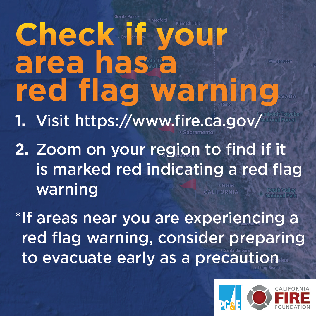 You can track active Red Flag Warnings by visiting CAL FIRE’s website and checking the “red flag warnings” box on the statewide map. https://www.fire.ca.gov/ |