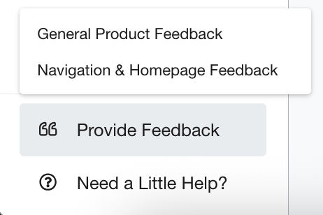 To leave feedback, select Provide Feedback from the homepage sidebar and then Navigation & Homepage Feedback.