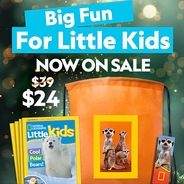 Your gift options include: • Nat Geo Little Kids magazine annual subscription • Six Nat Geo Little Kids Early-Reader Books • PLUS: 2 bonus issues Two FREE bonus gifts: • Meerkat Drawstring Bag • Meerkat Bookmark