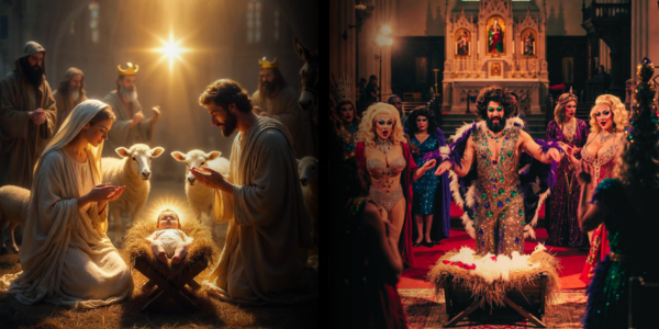 This is a cynical hijacking of Bethlehem’s miracle to peddle sexualized propaganda under the guise of creativity, mocking the Christ Child, His Immaculate Mother, and the purity of divine humility with wigs, corsets, and lewd reinterpretations.