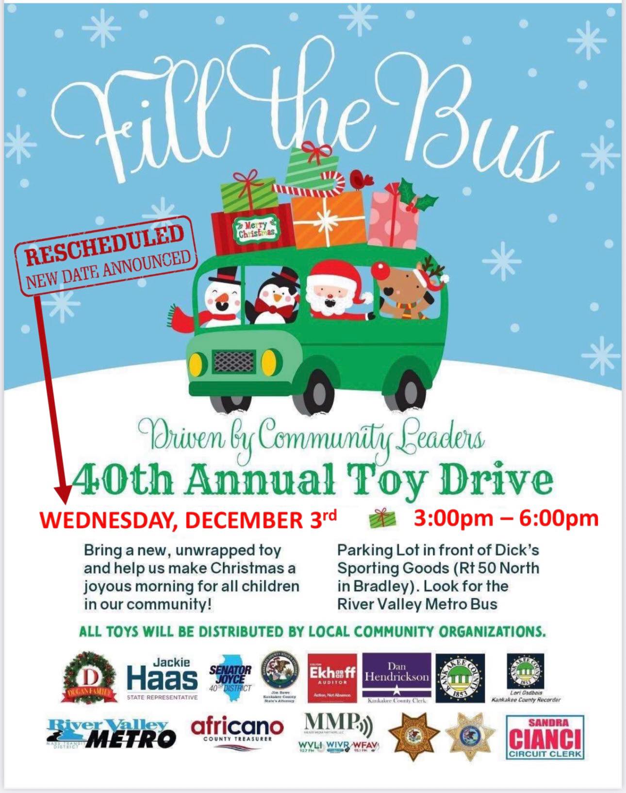 Due to the expected snow and hazardous travel conditions over the weekend, the Fill the Bus Toy Drive was rescheduled to today from 3–6 PM.