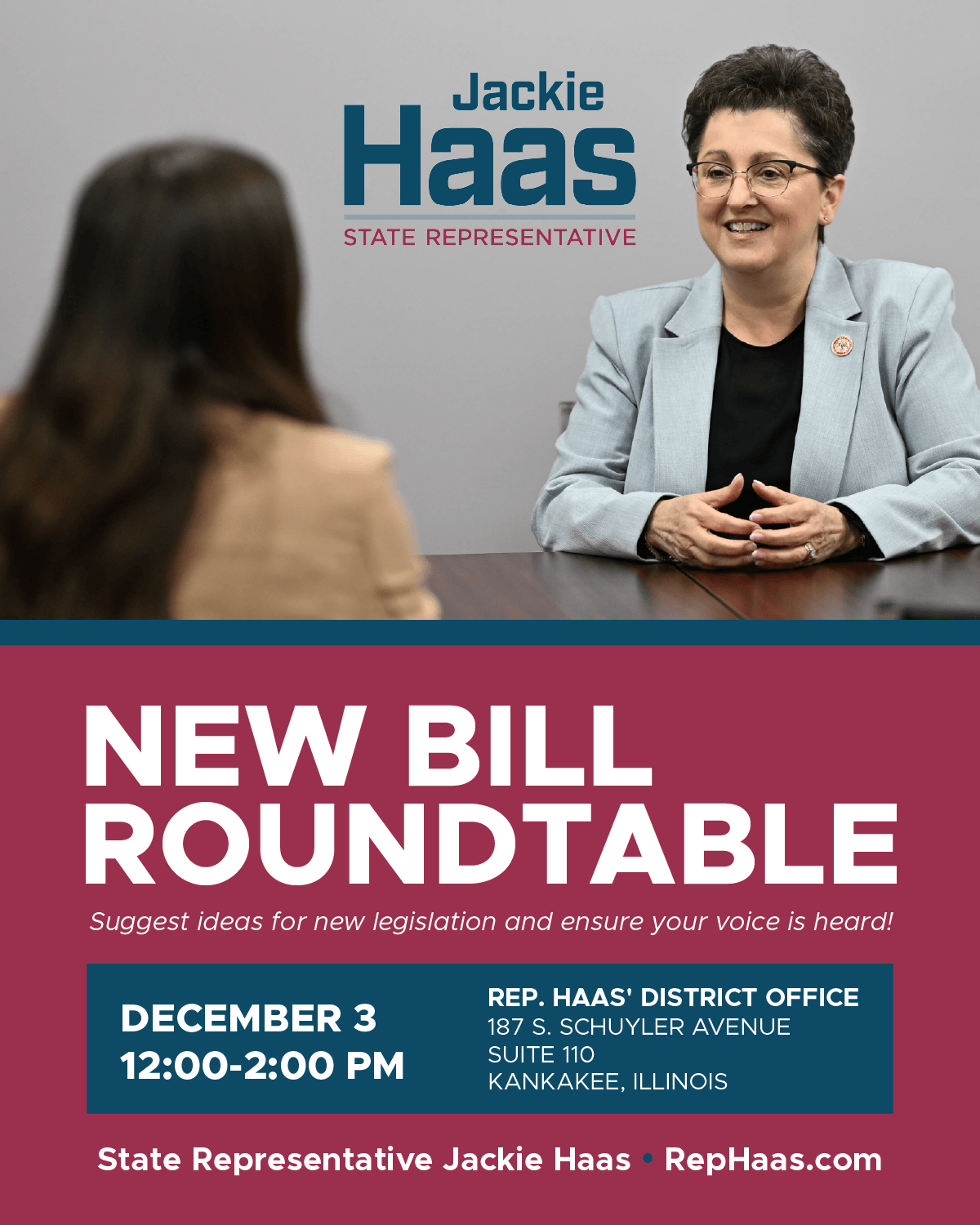 Rep. Haas' District Office | 187 Schuyler Avenue, Suite 110, Kankakee | 12 PM – 2 PM