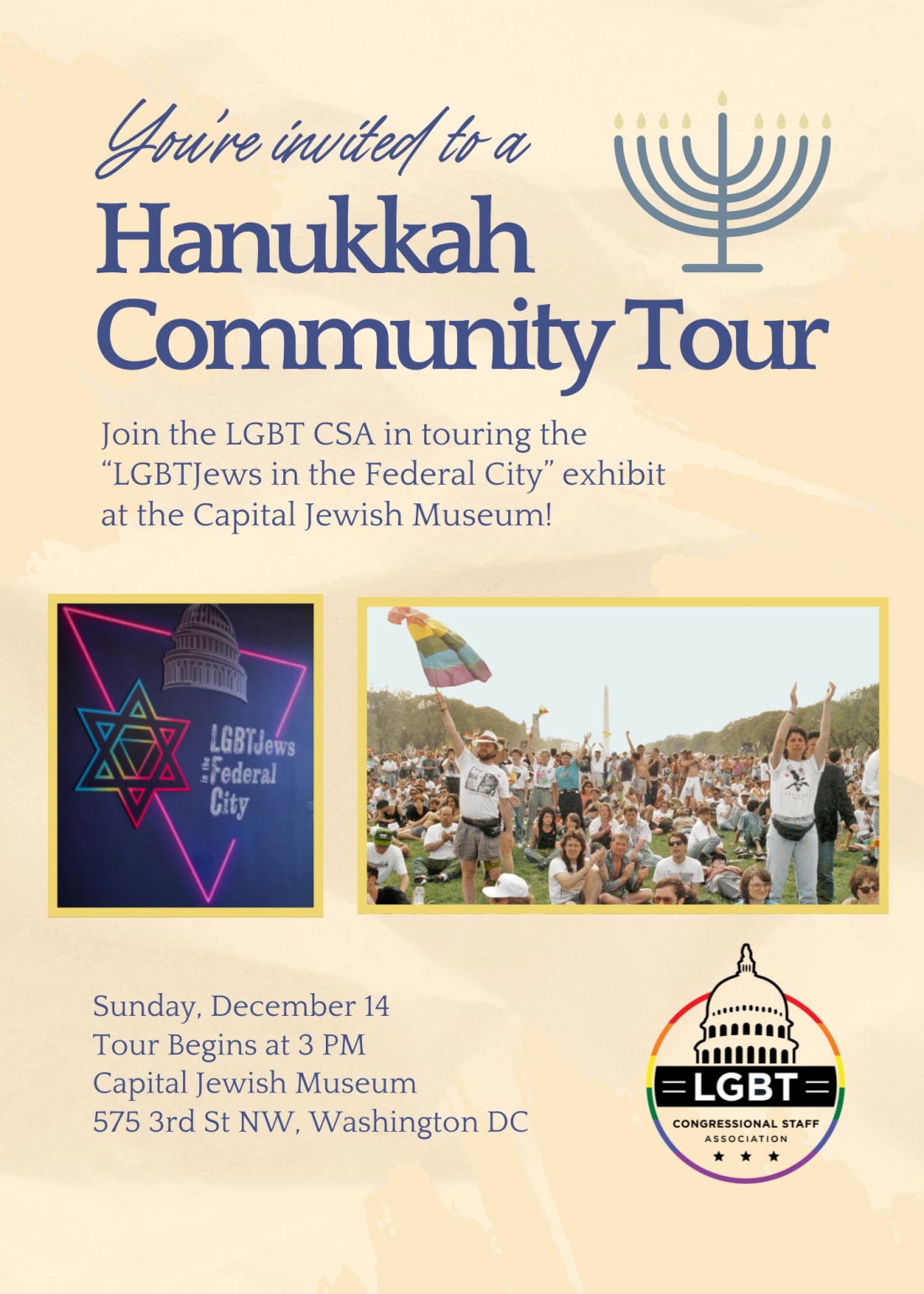 Submit your nominations by Friday, December 12, 2025. Self-nominations are welcome. This Month in the CommunityGLASS is proud to collaborate with organizations across the Hill that share our commitment to building a safe, affirming, and inclusive community. Below are a few upcoming opportunities open to GLASS members. December International LGBTQ+ Leaders ConferenceEach year, more than 700 LGBTQ+ elected officials, activists, leaders, and allies from around the globe gather in Washington, DC for three unforgettable days of connection, strategy, and inspiration at Victory Institute’s International LGBTQ+ Leaders Conference. The conference will be held at the JW Marriott in Washington, DC, from December 4 to December 6. Confirmed speakers include Governor Maura Healey (MA), Attorneys General Anne Lopez (HI) and Kris Mayes (AZ), Speaker Ryan Fecteau (ME), Member of Parliament Alex Greenwich (Australia), and Mayors Gina Ortiz Jones (San Antonio) and Todd Gloria (San Diego). Each of these trailblazers has made history — and continues to shape a more just, inclusive, and representative world. Women’s Congressional Staff Association GalaThe Women’s Congressional Staff Association (WCSA) cordially invites GLASS members to join them at their Winter Gala on Friday, December 5 from 7:00-10:00pm. WCSA is taking over the Naval Lodge for a night of glam, music and celebration. Tickets are $15 for WCSA members, $20 for plus-ones (one per member), and $30 for non-members. Your ticket includes bites + drinks! Dress Code: Formal / Black Tie Optional Think elegant gowns, chic cocktail dresses, and sharp suits! Buy your tickets here: https://www.womenscsa.com/wcsa-gala-tickets Georgetown law Hill Staffers Information SessionThe Georgetown Law Office of Admissions is hosting a special information session for Capitol Hill Staffers who are interested in learning about the admissions process for the full-time and evening programs at Georgetown Law. This event will take place next Monday, December 9 at 6:30pm on the campus of Georgetown Law, which is conveniently located a few blocks away from the Hill. If you wish to attend the session and receive additional details about the event, please register using this link: RSVP. Hanukkah Community TourJoin the LGBT Congressional Staff Association in touring the “LGBTJews in the Federal City” exhibit at the Capital Jewish Museum! Tickets are $20 each. RSVP below!