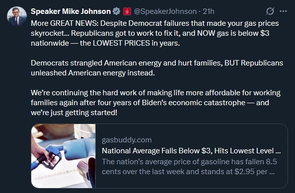 Notes from the Office of Speaker Mike Johnson Hello, friends! Thank you for subscribing to the Office of Speaker Johnson's newsletter highlighting what's happening on Capitol Hill and in Louisiana's 4th Congressional District. | This week, House Republicans passed two bills, the Small Business Regulatory Reform Act and the DUMP Red Tape Act, to codify President Trump's Executive Orders to unleash prosperity through deregulation, empower small businesses, and foster economic growth. Following House passage, Speaker Johnson said, "Small businesses are the backbone of America’s economy, and they deserve a direct line to report harmful red tape – and a federal government that adapts and finds a way to fix it. President Trump and Congressional Republicans are restoring accountability and advancing a deregulatory agenda that delivers real positive relief to Main Street." Click here for more on these bills. | On Thursday, the House passed three commonsense measures this week – the PROTECT Our Kids Act, the TRACE Act, and the CLASS Act – to increase transparency in America’s schools and protect students from adversarial foreign influence and propaganda. Following House passage, Speaker Johnson said, "These three important measures improve transparency, strengthen parental rights, and ensure America’s classrooms remain free from harmful foreign propaganda. House Republicans will continue acting decisively to protect America’s next generation and preserve the integrity of our education system." | At the weekly House Republican Leadership press conference, Speaker Johnson discussed House Republicans’ historic work in the 119th Congress to bring down costs for working families, fix Democrats’ broken health care system, and rid American streets of violent criminals and dangerous illegal aliens. Speaker Johnson said, “Republicans have been delivering and working to bring down costs for American families, to fix the Democrats’ broken health care system, and to rid our streets of violent criminals and dangerous illegal aliens.” Click the image below to watch his remarks. | On Tuesday, Speaker Johnson joined President Trump and the Dell family to celebrate their historic $6.25 billion donation to the Trump Accounts program. These pro-family savings accounts—established through the Working Families Tax Cuts—will provide a $1,000 one-time government contribution for every child born between January 1, 2025, and December 31, 2028. Families and others may contribute up to $5,000 annually, and each child in a household with median incomes below $150,000 will receive an additional $250 thanks to the Dell family’s philanthropic gift. Click here for more details on the Trump Accounts. | Republicans are committed to bringing down costs for the American people and unleashing American energy. Nationwide, gas prices are at their lowest in years, and Republicans will continue to ensure life is affordable for American families. | On Tuesday, Speaker Johnson hosted the 2025 Capitol Christmas Tree Lighting Ceremony on the West Front Lawn of the U.S. Capitol. Nevada fourth grader and winner of the Capitol Christmas Tree essay contest, Grady Armstrong, helped light the 53-foot red fir, harvested from the Humboldt-Toiyabe National Forest and affectionately known as ‘Silver Belle.’ Click the image below to Speaker Johnson's remarks. | Speaker Johnson joined Fox Business' Varney & Co. to discuss House Republicans' accomplishments in the 119th Congress and their work to bring down costs for the American people. Click the image to watch, and check our YouTube channel for more. | Speaker Johnson met with visitors from Louisiana's Fourth Congressional District. Speaker Johnson is always thrilled to see familiar faces in our nation's capital. Don't hesitate to let our office know if you are visiting Washington, D.C. | Speaker Johnson is honored and proud to represent the great people of Louisiana's 4th Congressional District. He is always grateful for your support. Never hesitate to reach out. Thank you for reading, | Office of Speaker Mike Johnson | Sign up for Speaker Johnson's newsletter to get updates from Washington! | Bossier City 2250 Hospital Drive Suite 248 Bossier City, LA 71111 (318) 840-0309 | Washington, D.C. 521 Cannon House Office Building Washington, DC 20515 (202) 225-2777 | Northwestern State University - Ft. Polk Mailing: P.O. Box 779 Leesville, LA 71496 (337) 423-4232 | DeRidder Mailing: P.O. Box 160 DeRidder, LA 70634 (337) 226-6385 | Ruston 401 N. Trenton St. Ruston, LA 712070 (318) 497-6610 | |